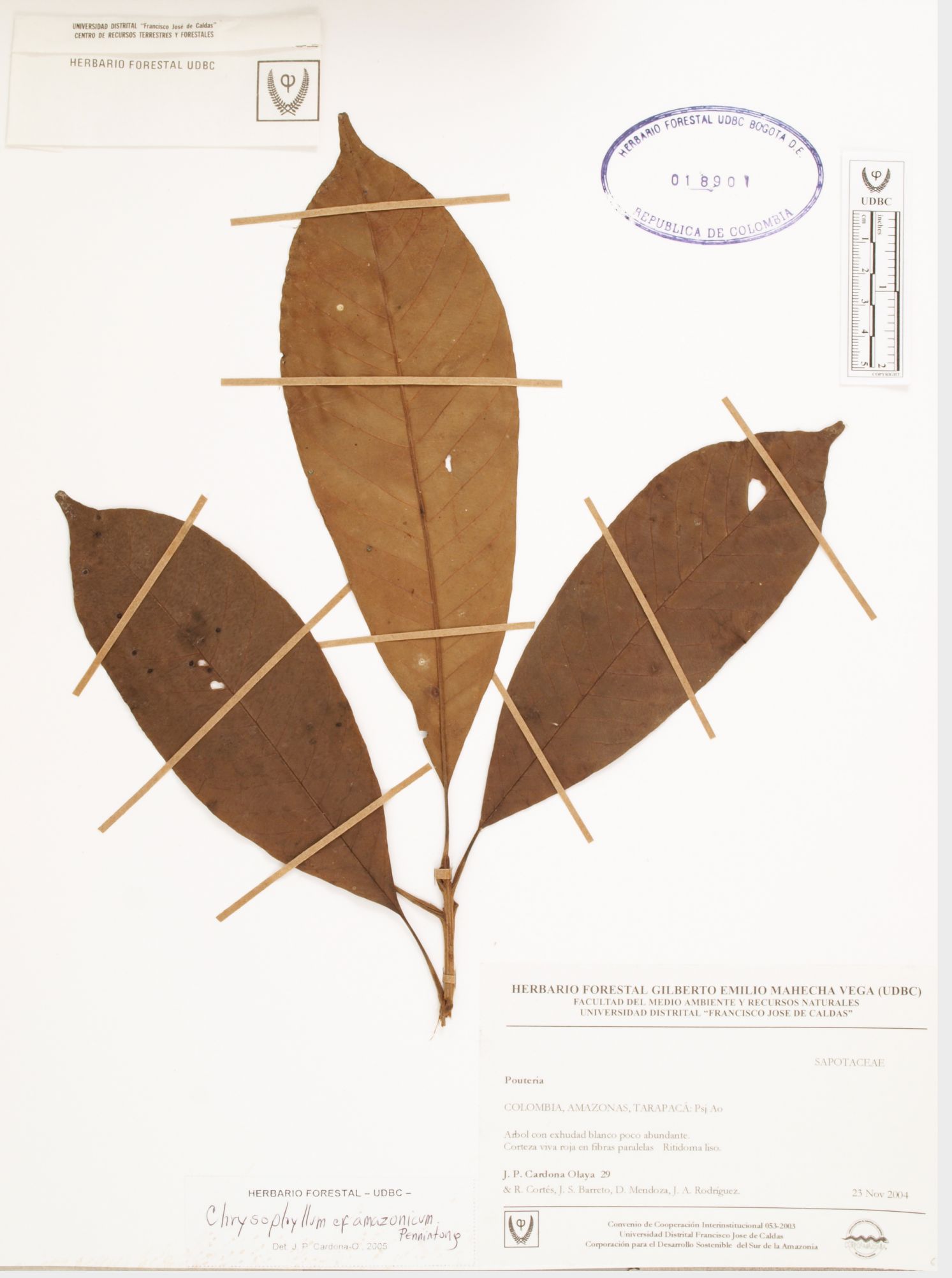 Fotografía del ejemplar Cardona, J. 29, determinado como Chrysophyllum amazonicum en el año 2005