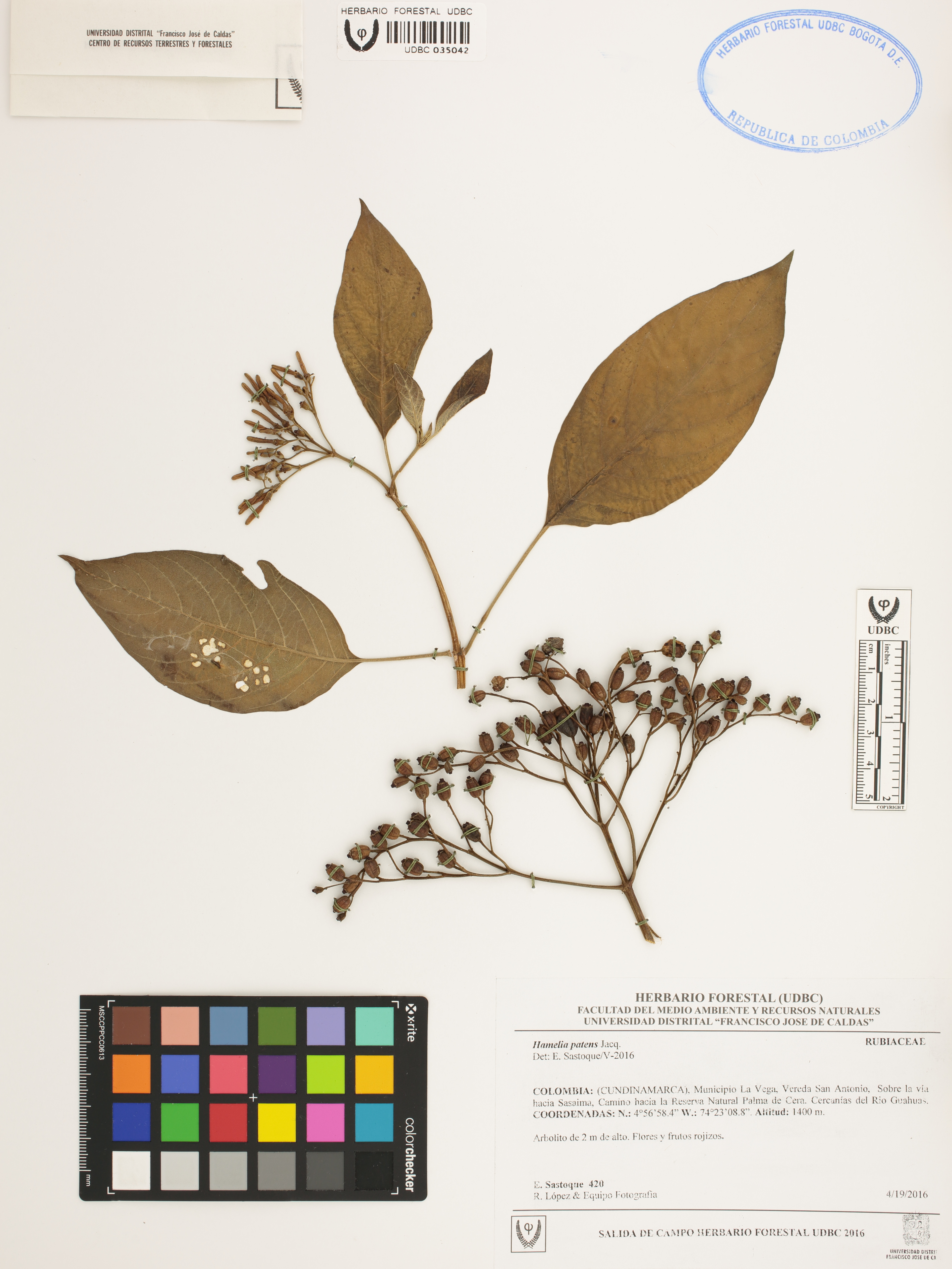 Fotografía del ejemplar Sastoque, E. 420, determinado como Hamelia patens en el año 2016
