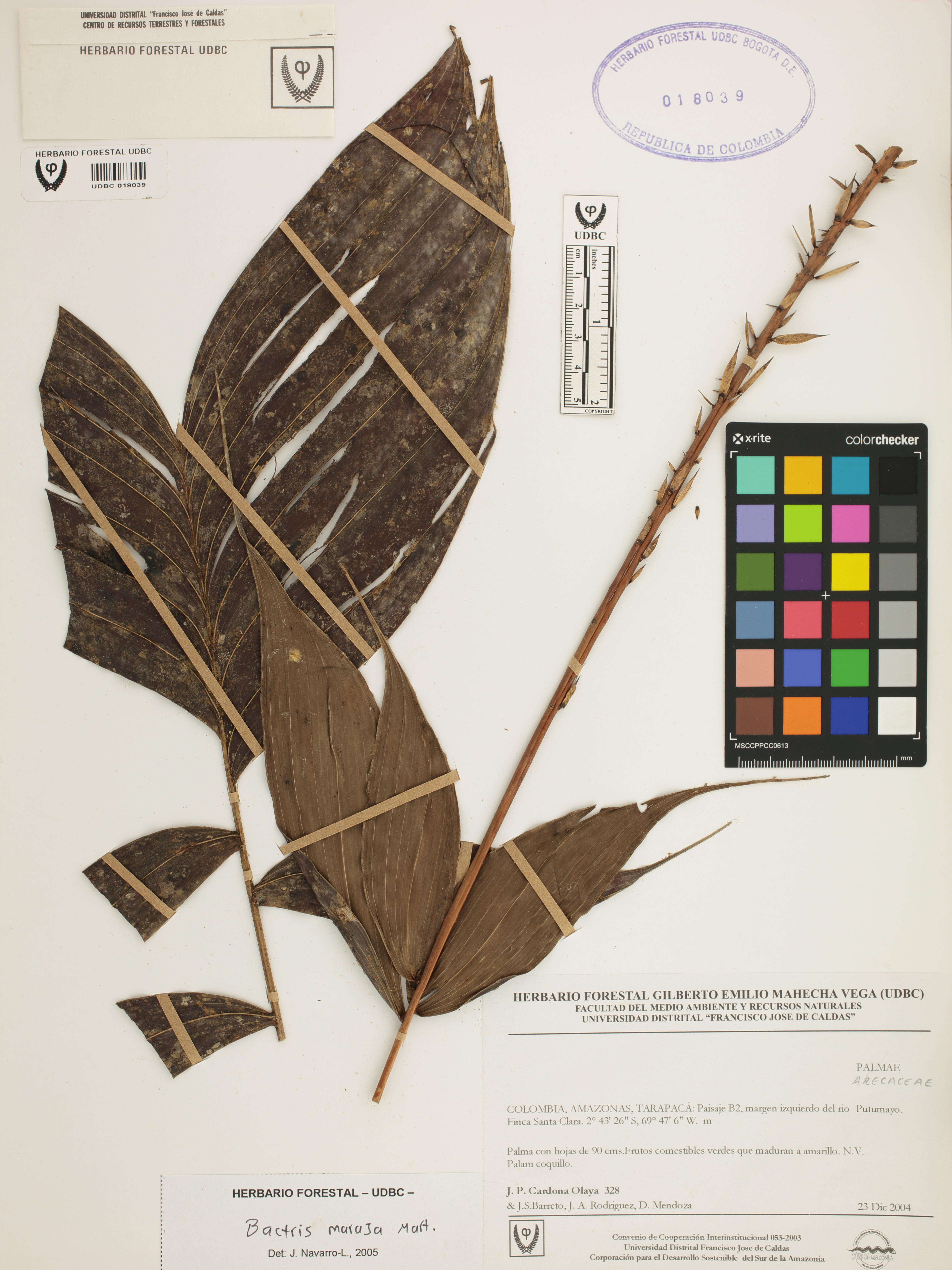 Fotografía del ejemplar Cardona, J. 328, determinado como Bactris maraja en el año 2005