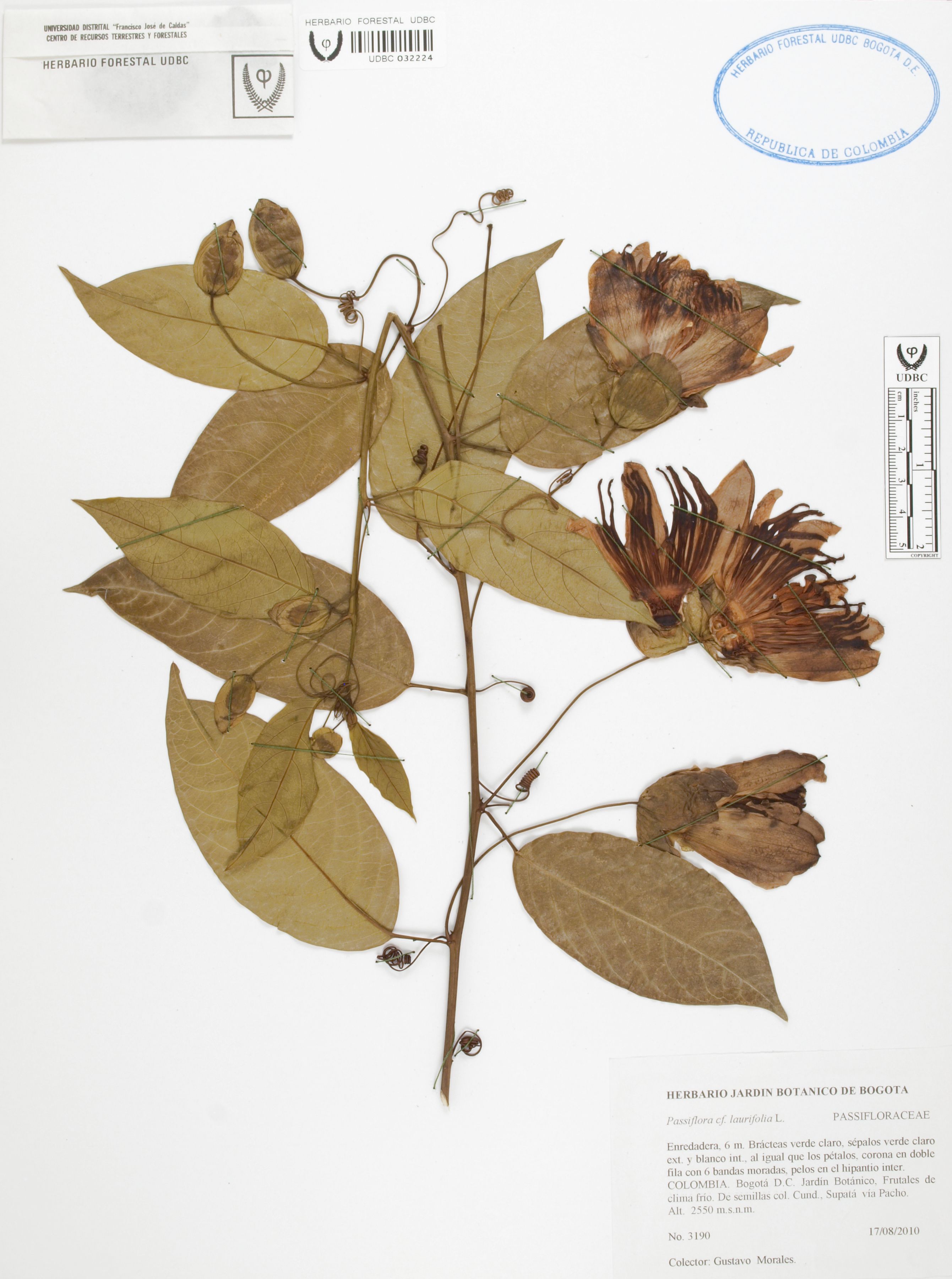 Fotografía del ejemplar Morales, G. 3190, determinado como Passiflora laurifolia