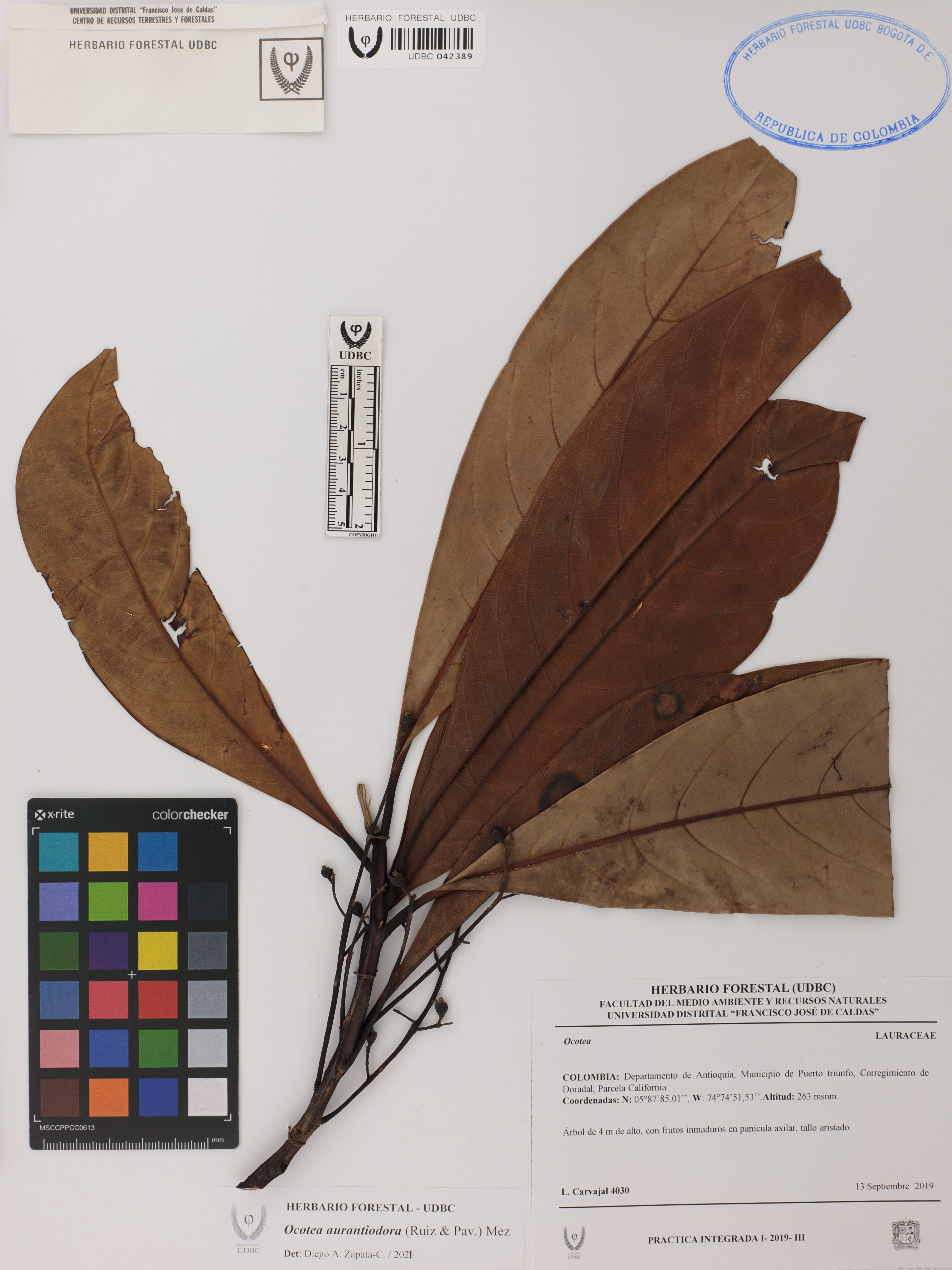 Fotografía del ejemplar Carvajal, L. 4030, determinado como Ocotea aurantiodora en el año 2021