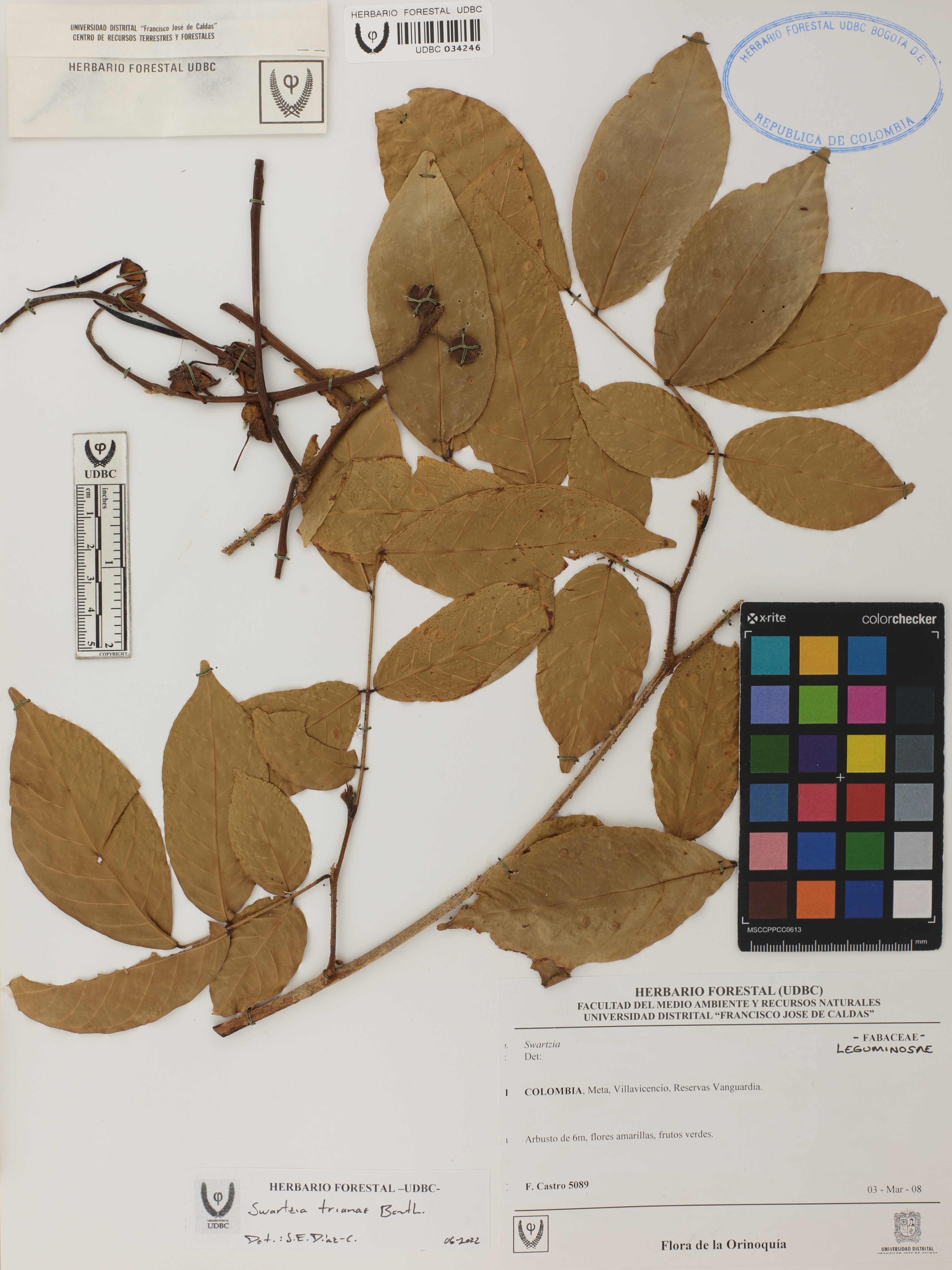 Fotografía del ejemplar Castro, F. 5089, determinado como Swartzia trianae en el año 2022