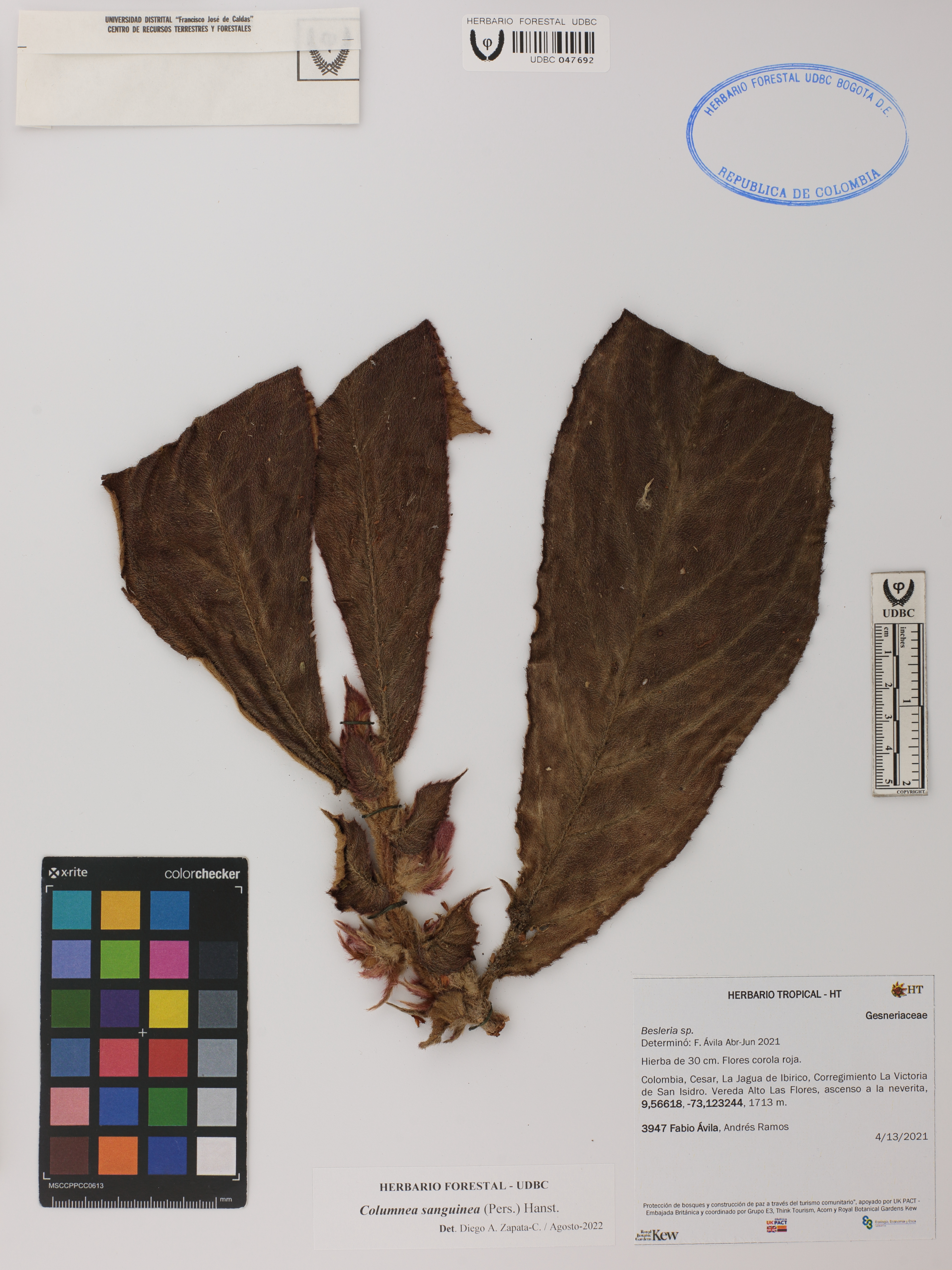 Fotografía del ejemplar Ávila, F. 3947, determinado como Columnea sanguinea en el año 2022