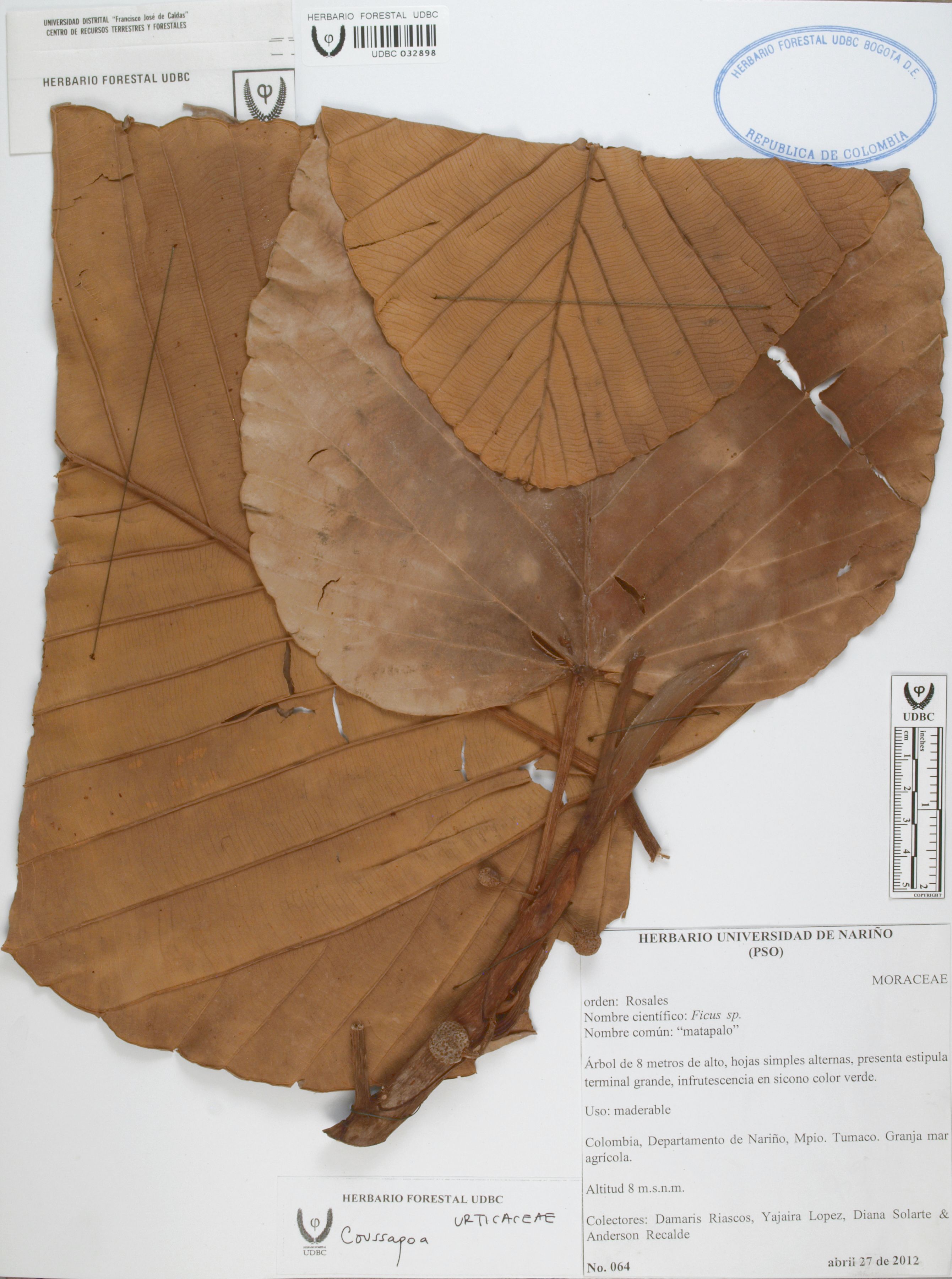 Fotografía del ejemplar Riascos, D. 64, determinado como Coussapoa sp.
