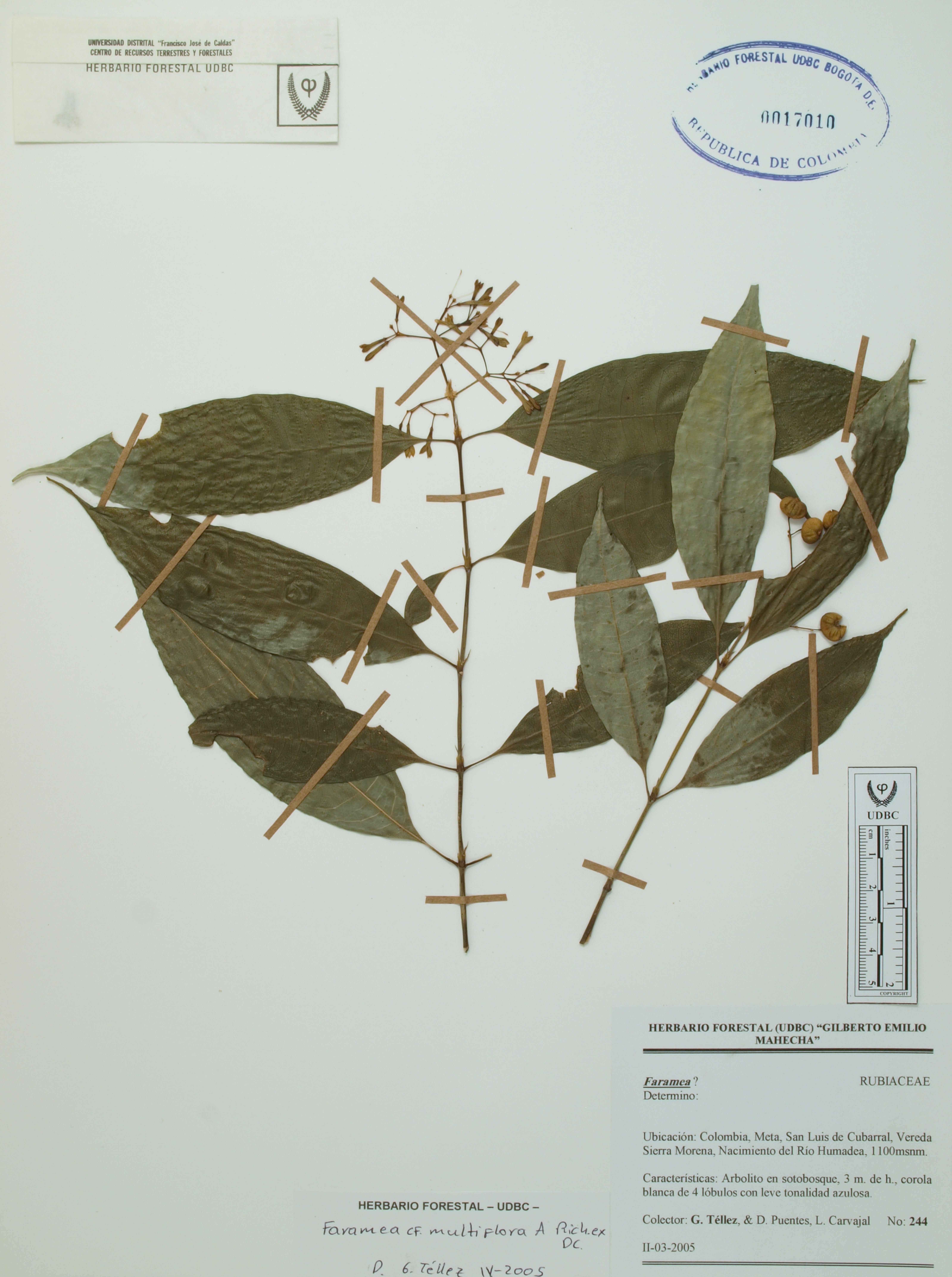 Fotografía del ejemplar Téllez, G. 244, determinado como Faramea multiflora en el año 2005