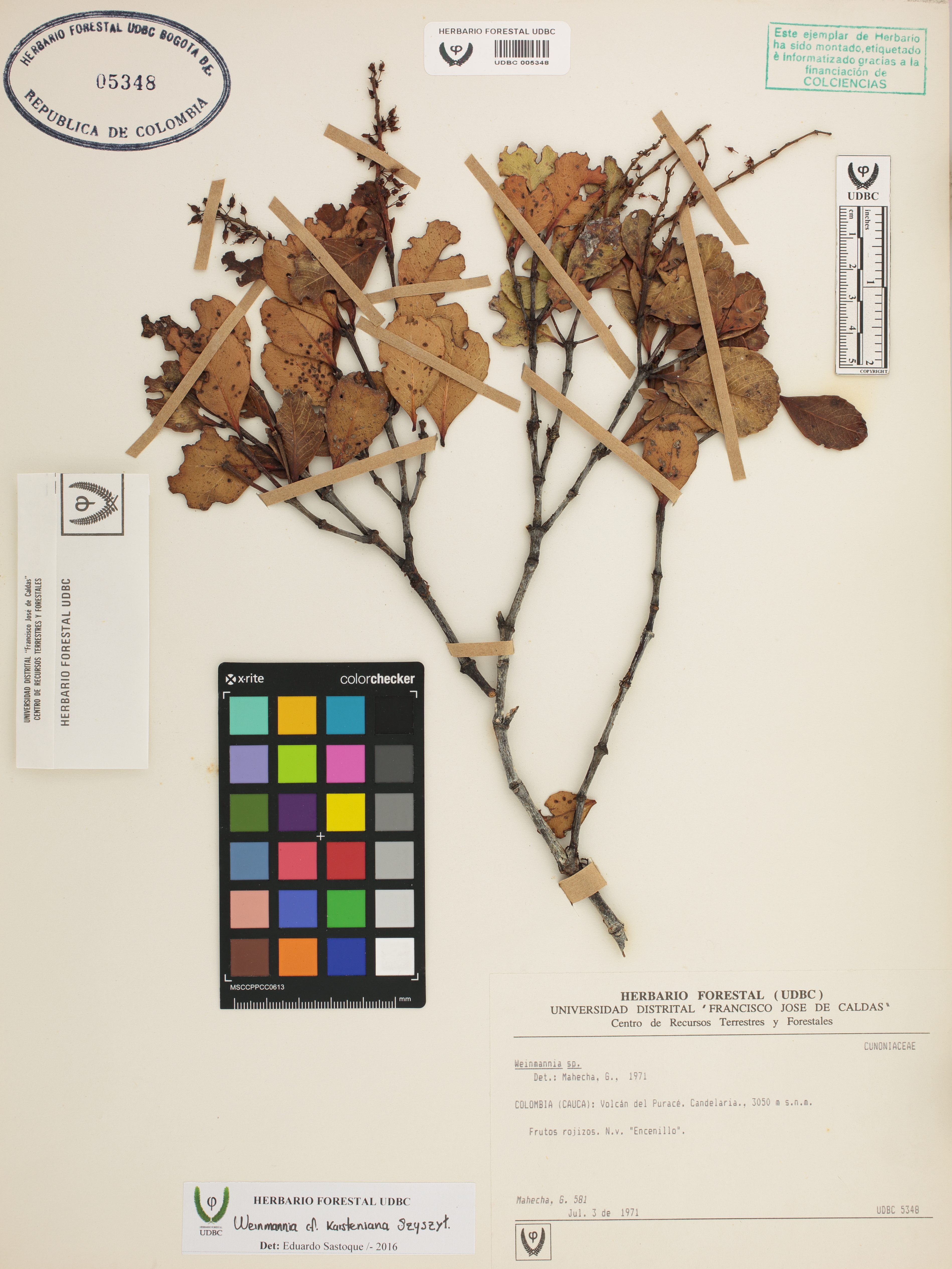 Fotografía del ejemplar Mahecha, G. 581, determinado como Weinmannia karsteniana en el año 2016