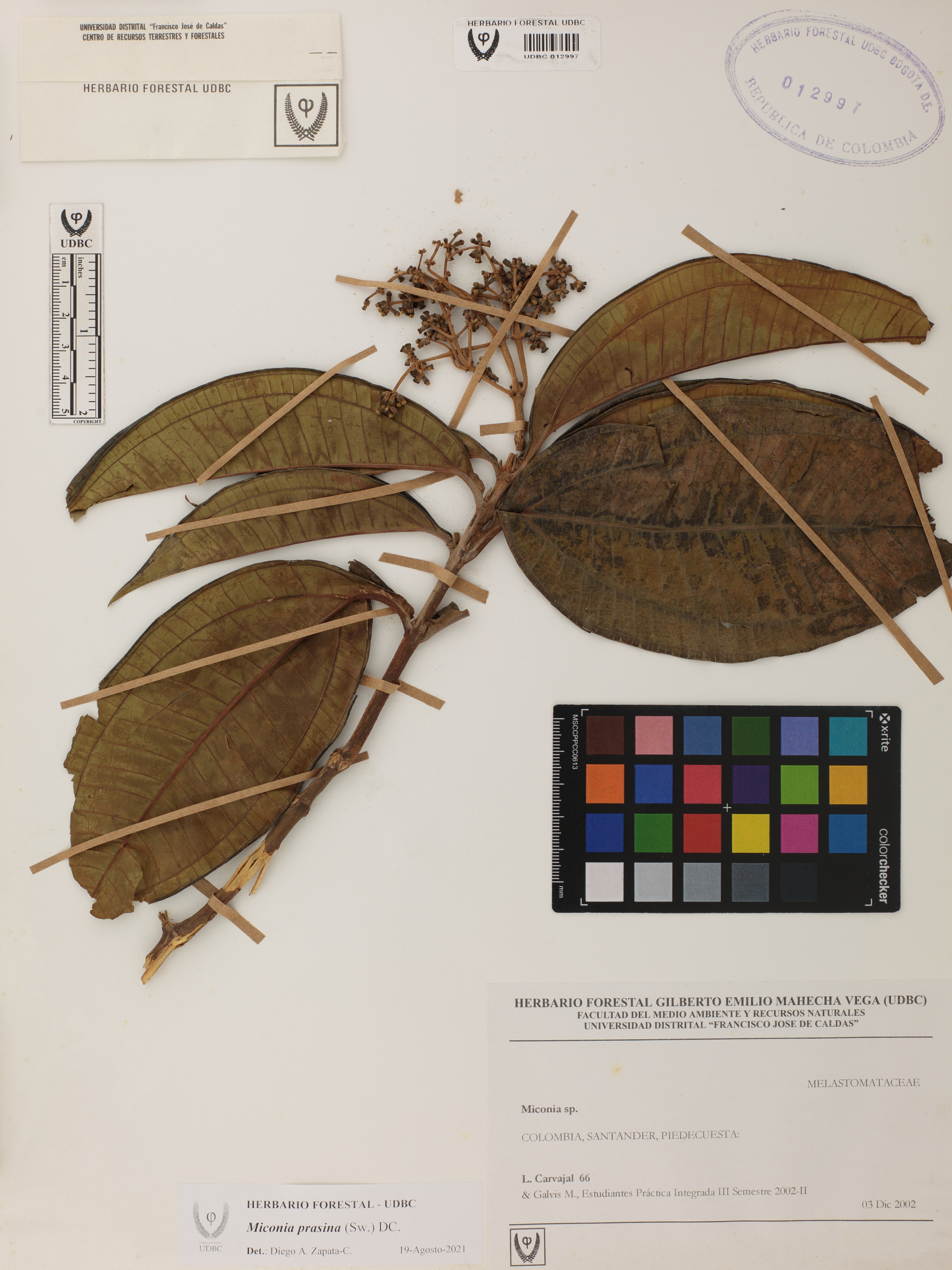 Fotografía del ejemplar Carvajal, L. 66, determinado como Miconia prasina en el año 2021