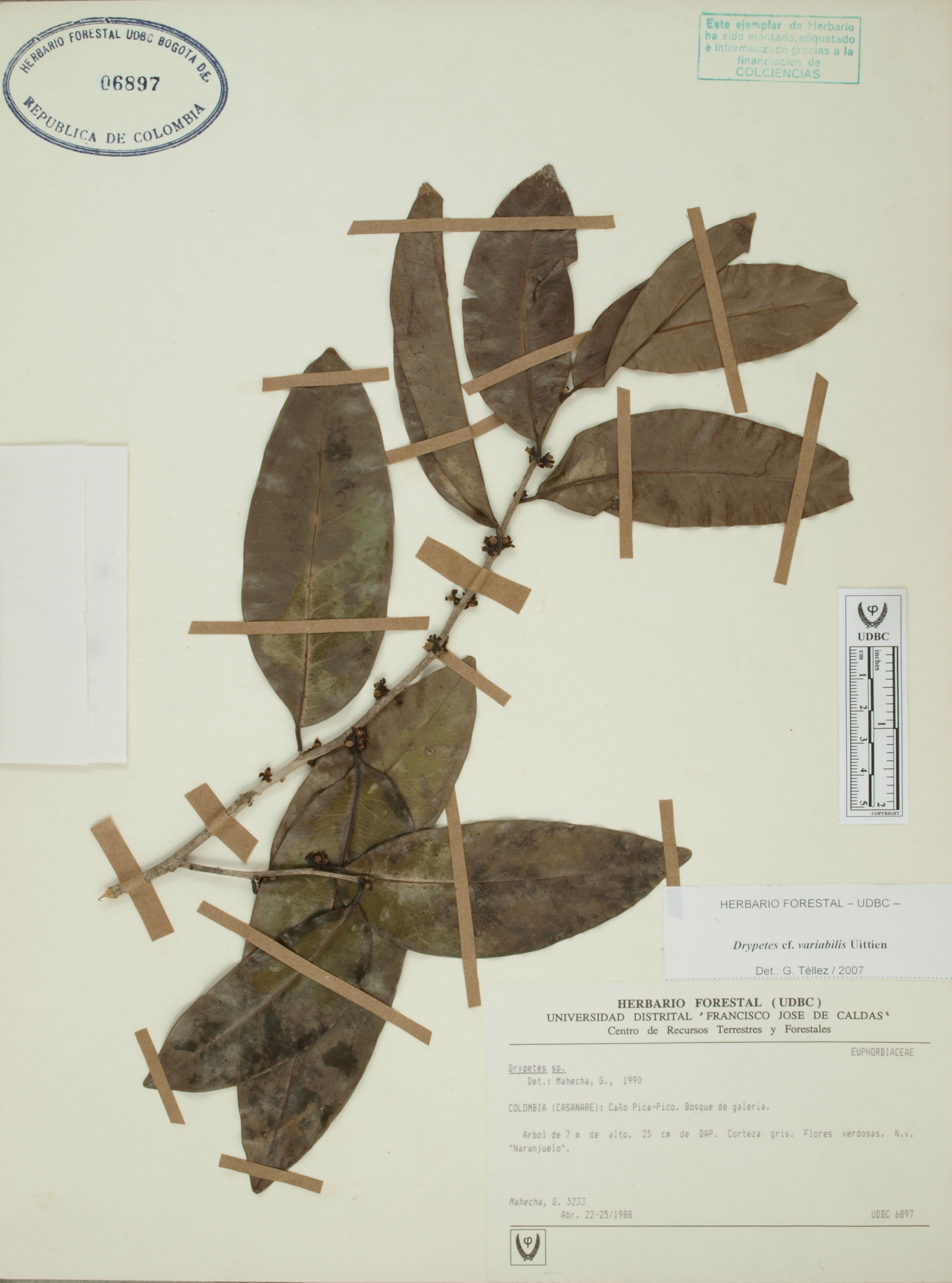 Fotografía del ejemplar Mahecha, G. 5233, determinado como Drypetes variabilis en el año 2007
