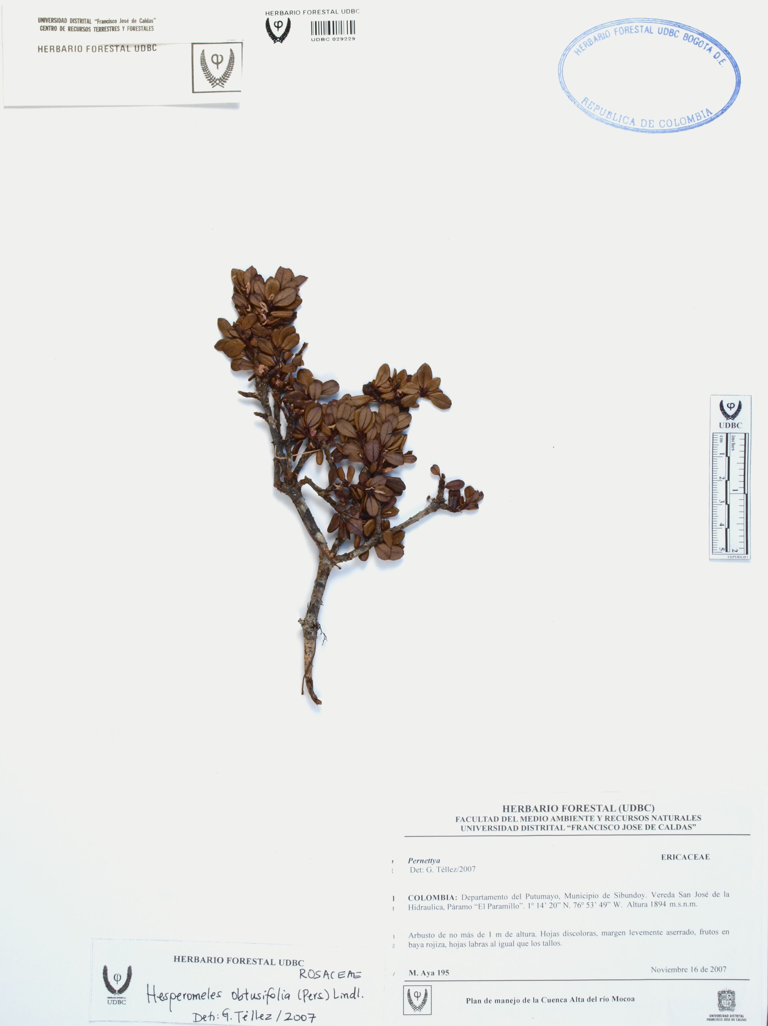 Fotografía del ejemplar Aya, M. 195, determinado como Hesperomeles obtusifolia en el año 2007