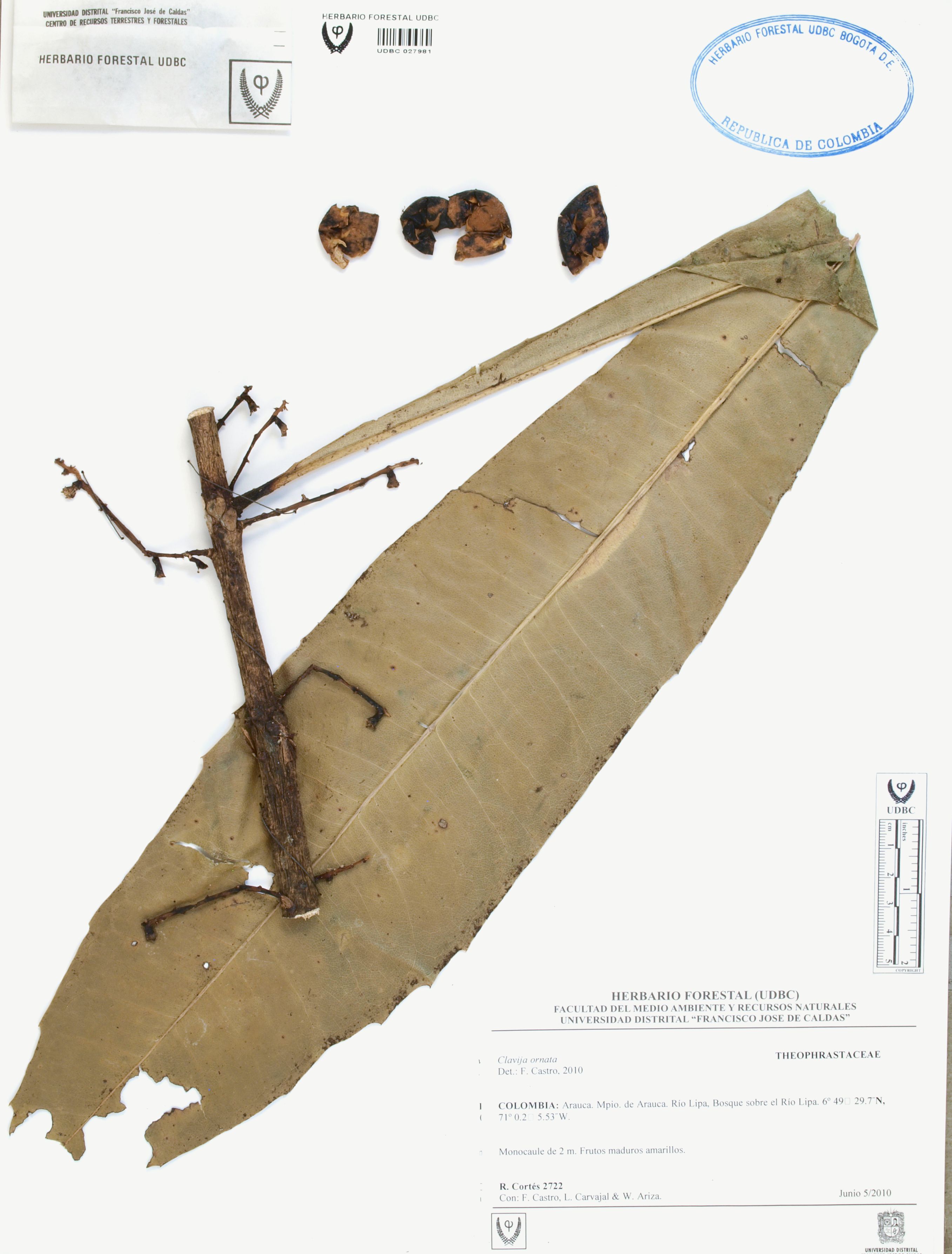 Fotografía del ejemplar Cortés-B., R. 2722, determinado como Clavija ornata en el año 2010