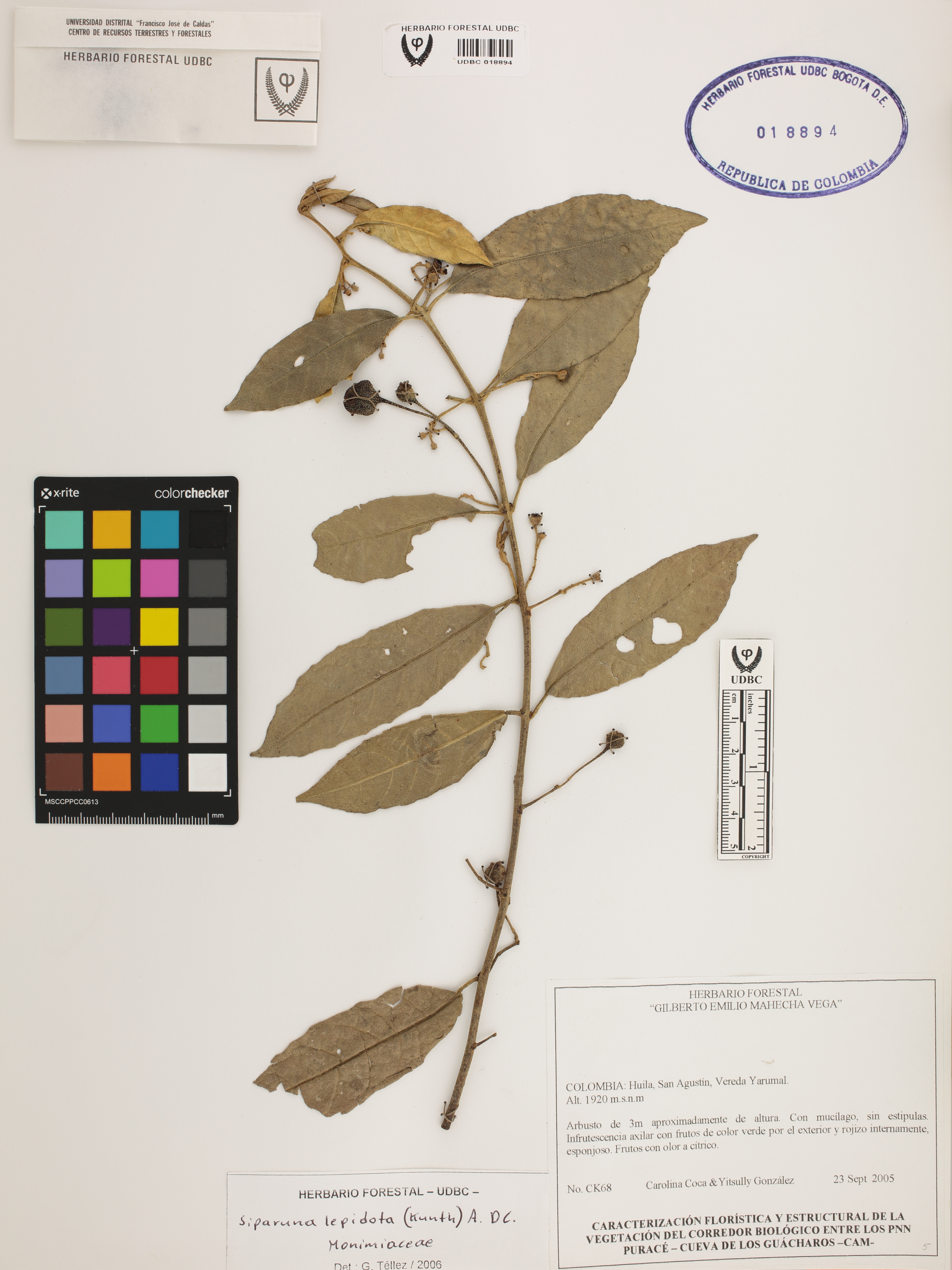 Fotografía del ejemplar Coca, C. 68, determinado como Siparuna lepidota en el año 2006