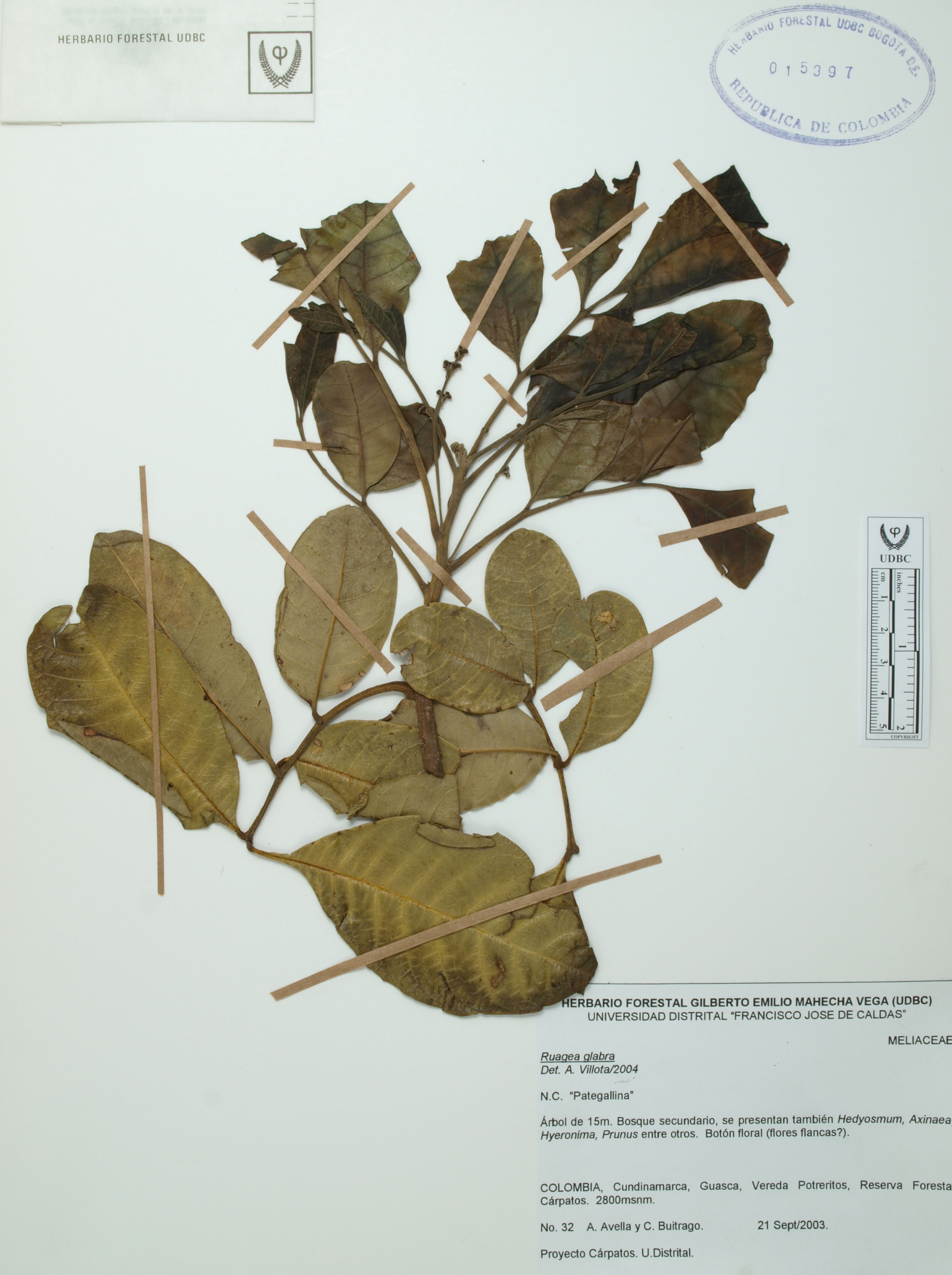 Fotografía del ejemplar Avella, A. 32, determinado como Ruagea glabra en el año 2004