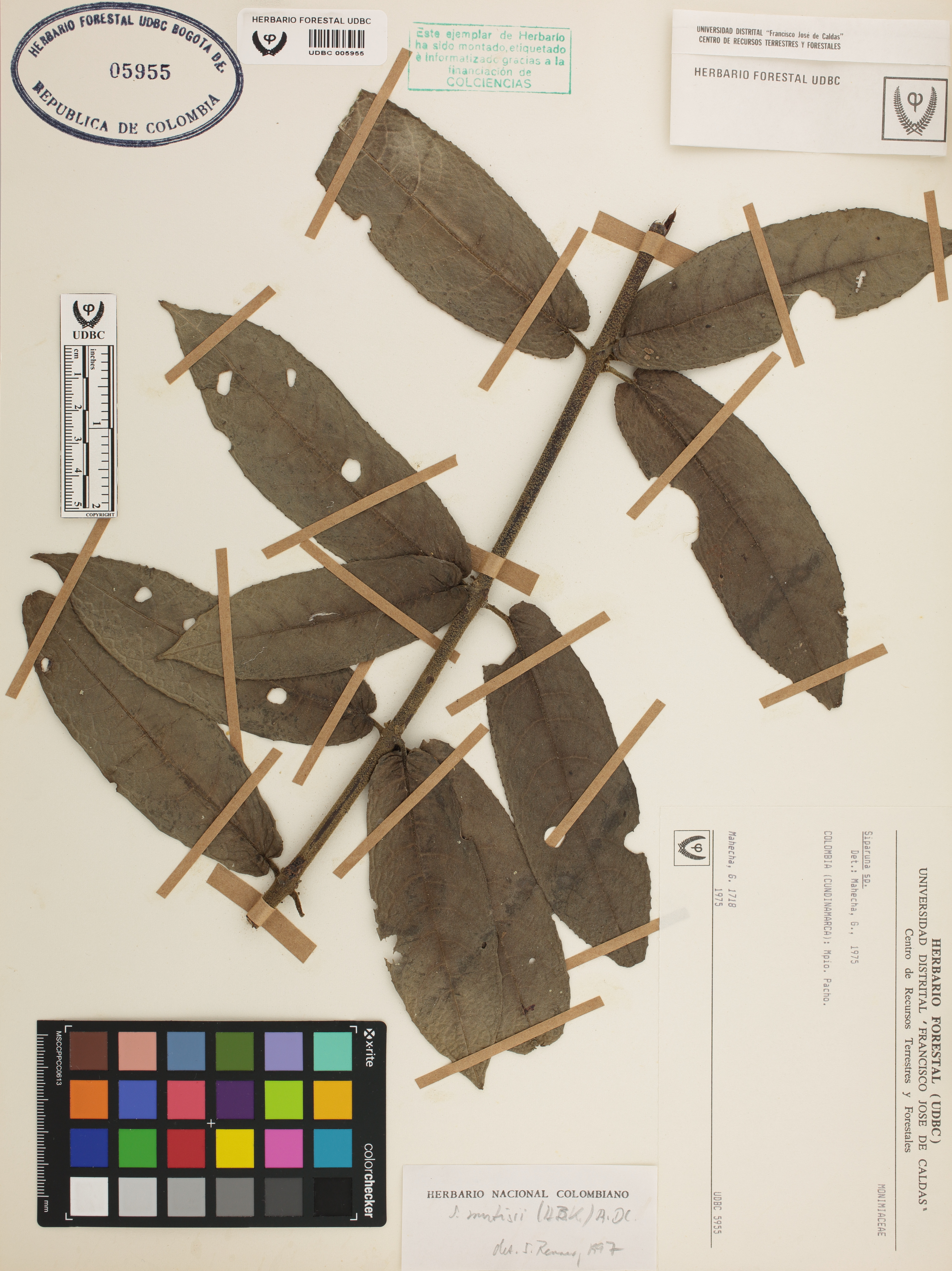Fotografía del ejemplar Mahecha, G. 1718, determinado como Siparuna mutisii en el año 1997