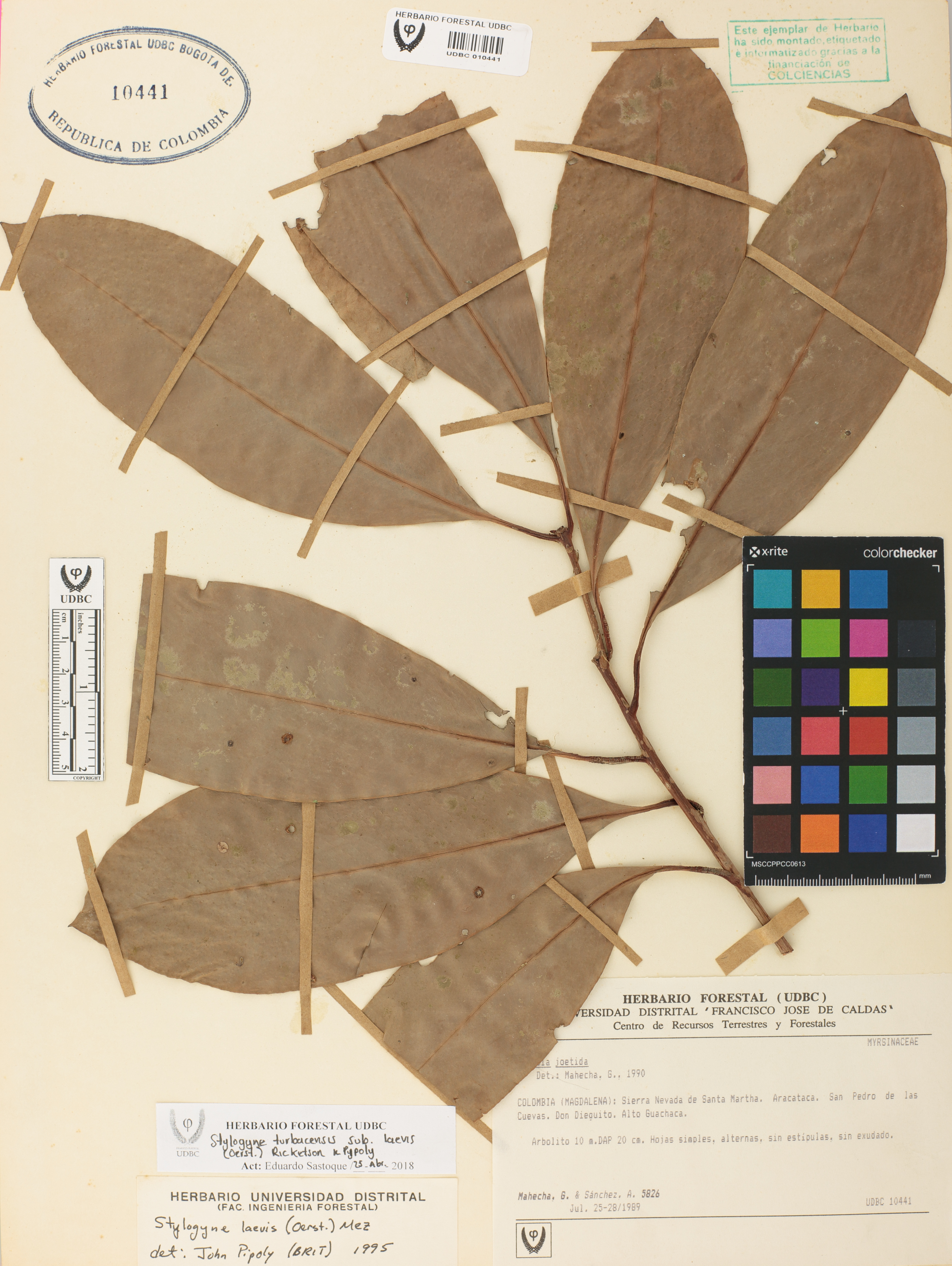 Fotografía del ejemplar Mahecha, G. 5826, determinado como Stylogyne turbacensis subsp. laevis en el año 1995