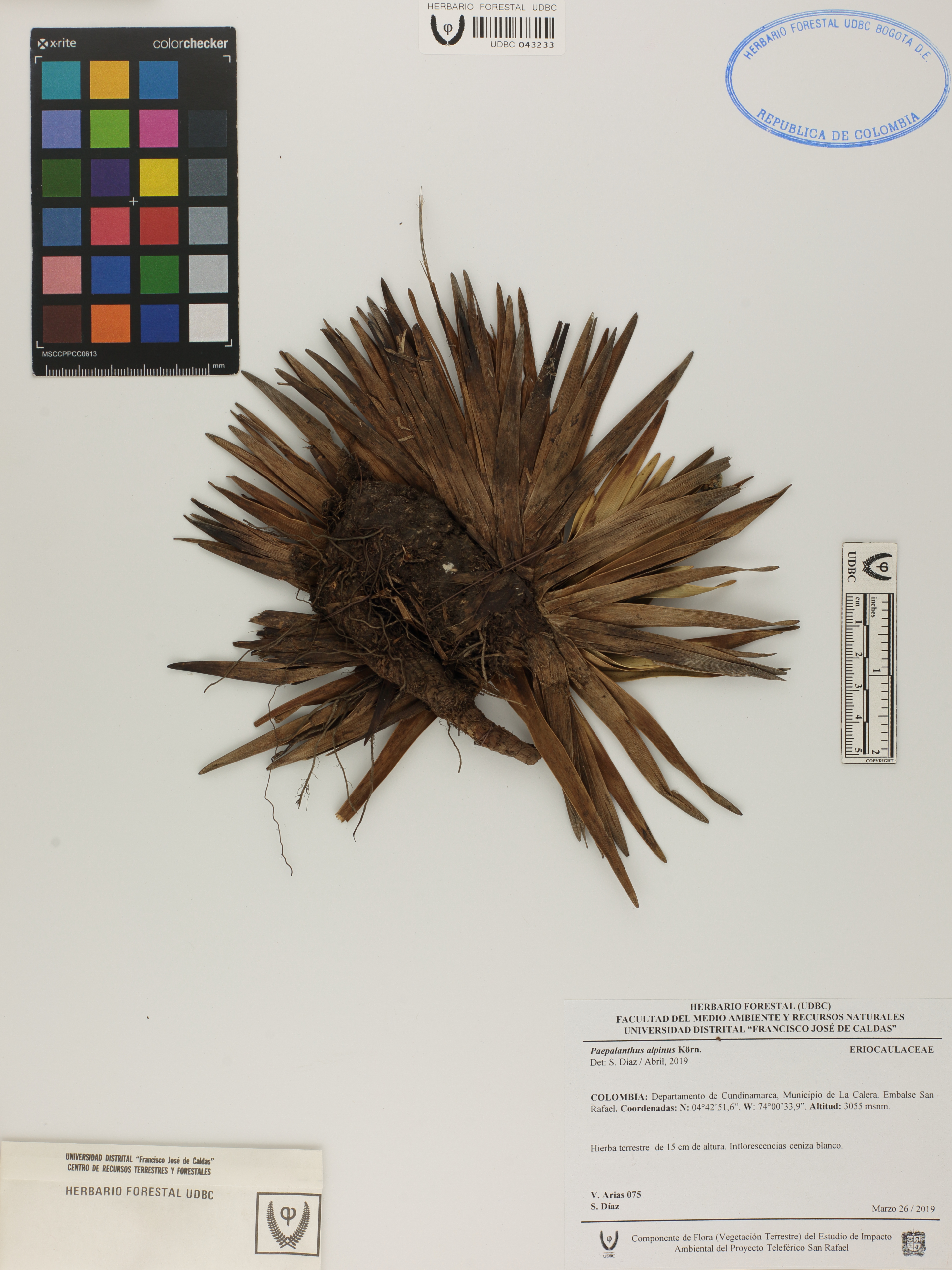 Fotografía del ejemplar Arias, V. 75, determinado como Paepalanthus alpinus en el año 2019