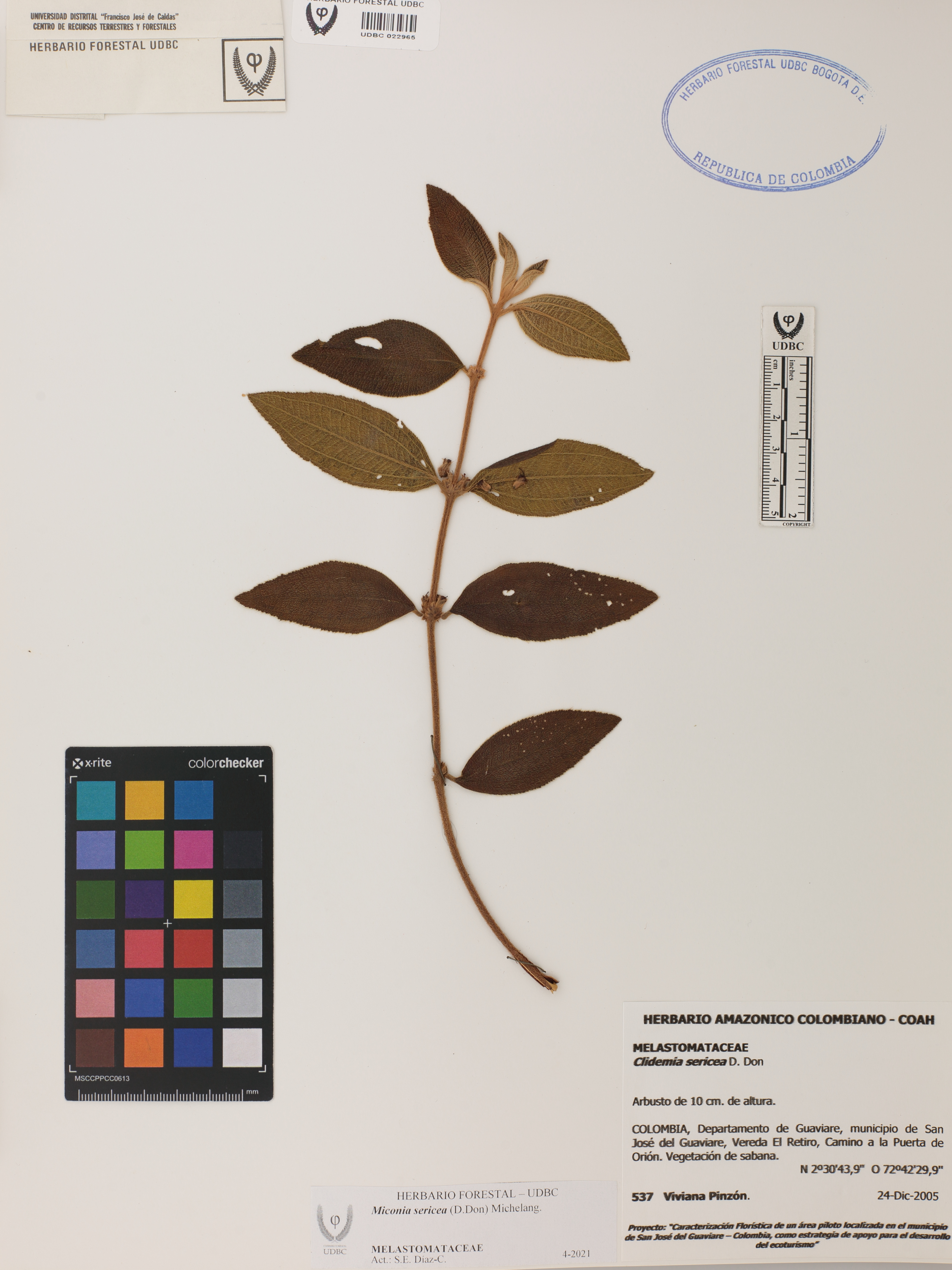 Fotografía del ejemplar Pinzón, V. 537, determinado como Miconia sericea en el año 2005