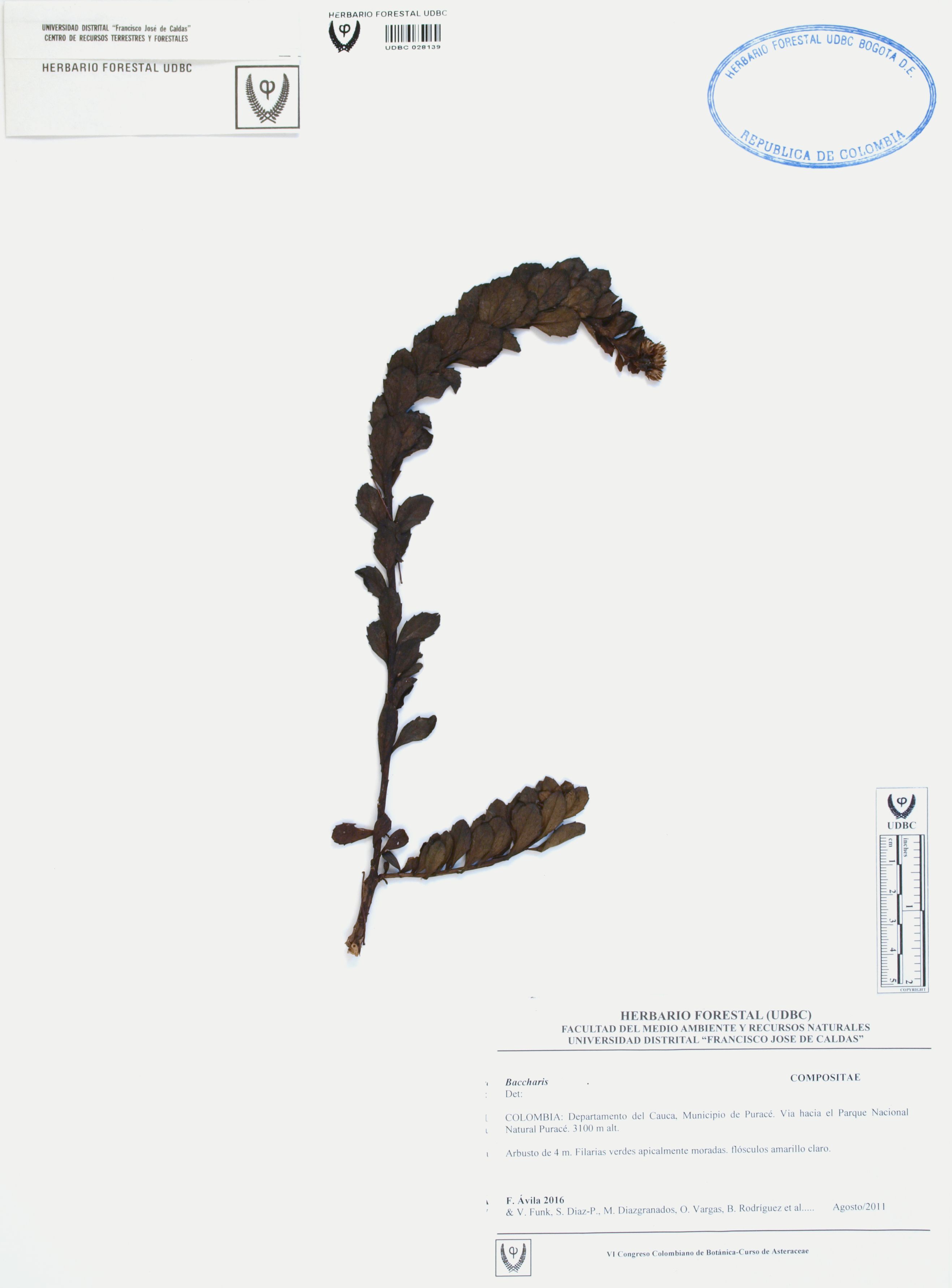 Fotografía del ejemplar Ávila, F. 2016, determinado como Baccharis sp.