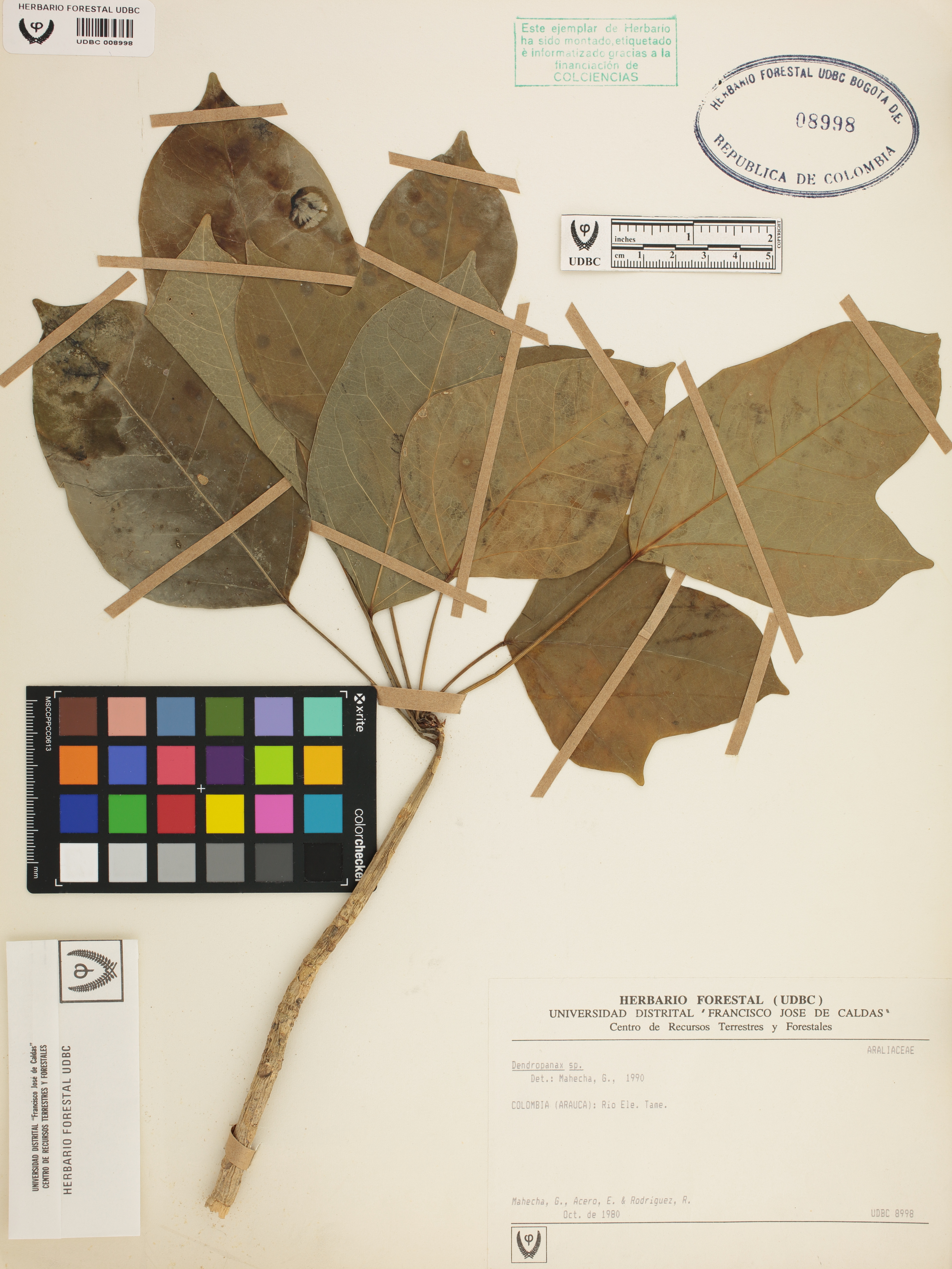 Fotografía del ejemplar Mahecha, G., determinado como Dendropanax sp. en el año 1990