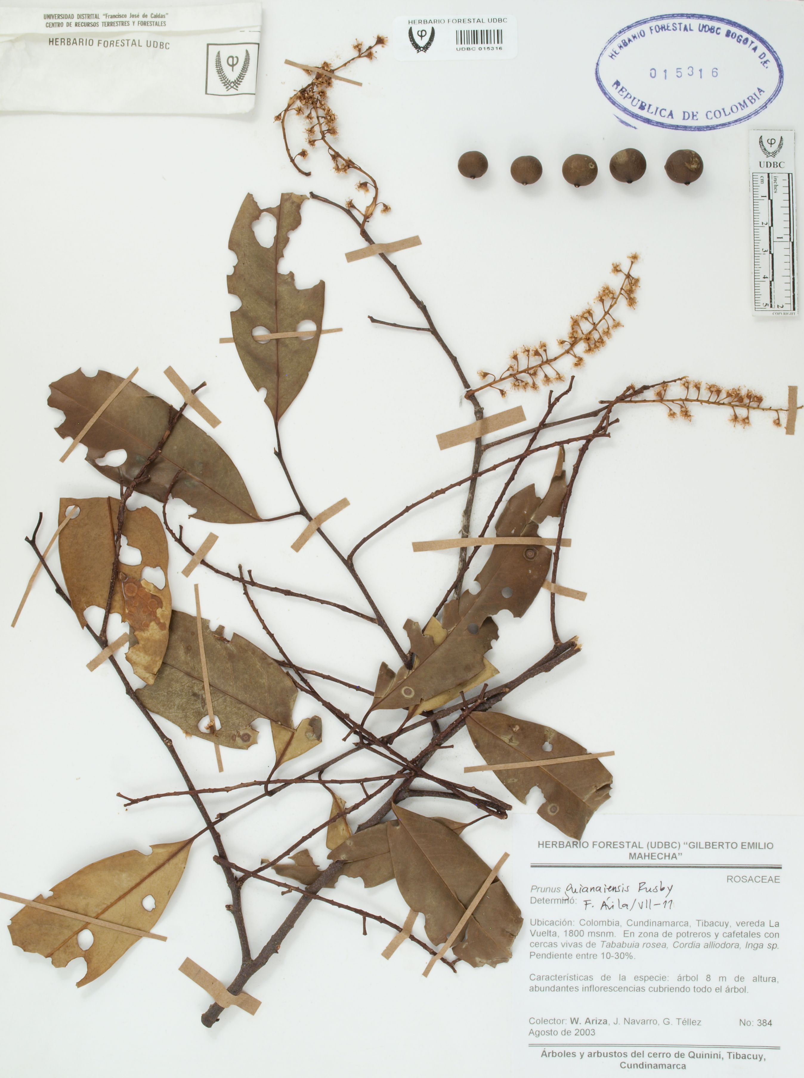Fotografía del ejemplar Ariza, W. 384, determinado como Prunus guanaiensis en el año 2011