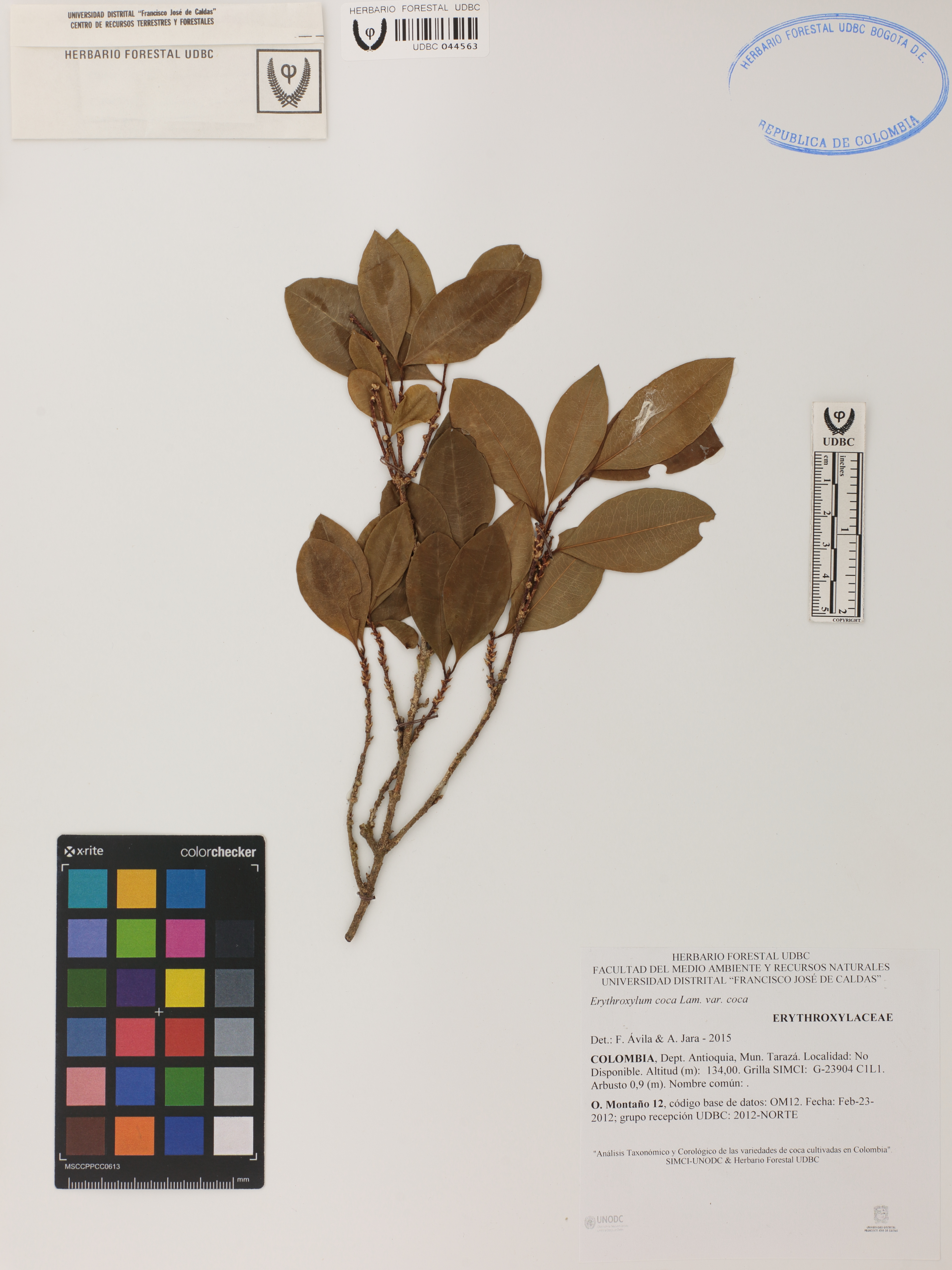 Fotografía del ejemplar Montaño, O. 12, determinado como Erythroxylum coca var. coca en el año 2015
