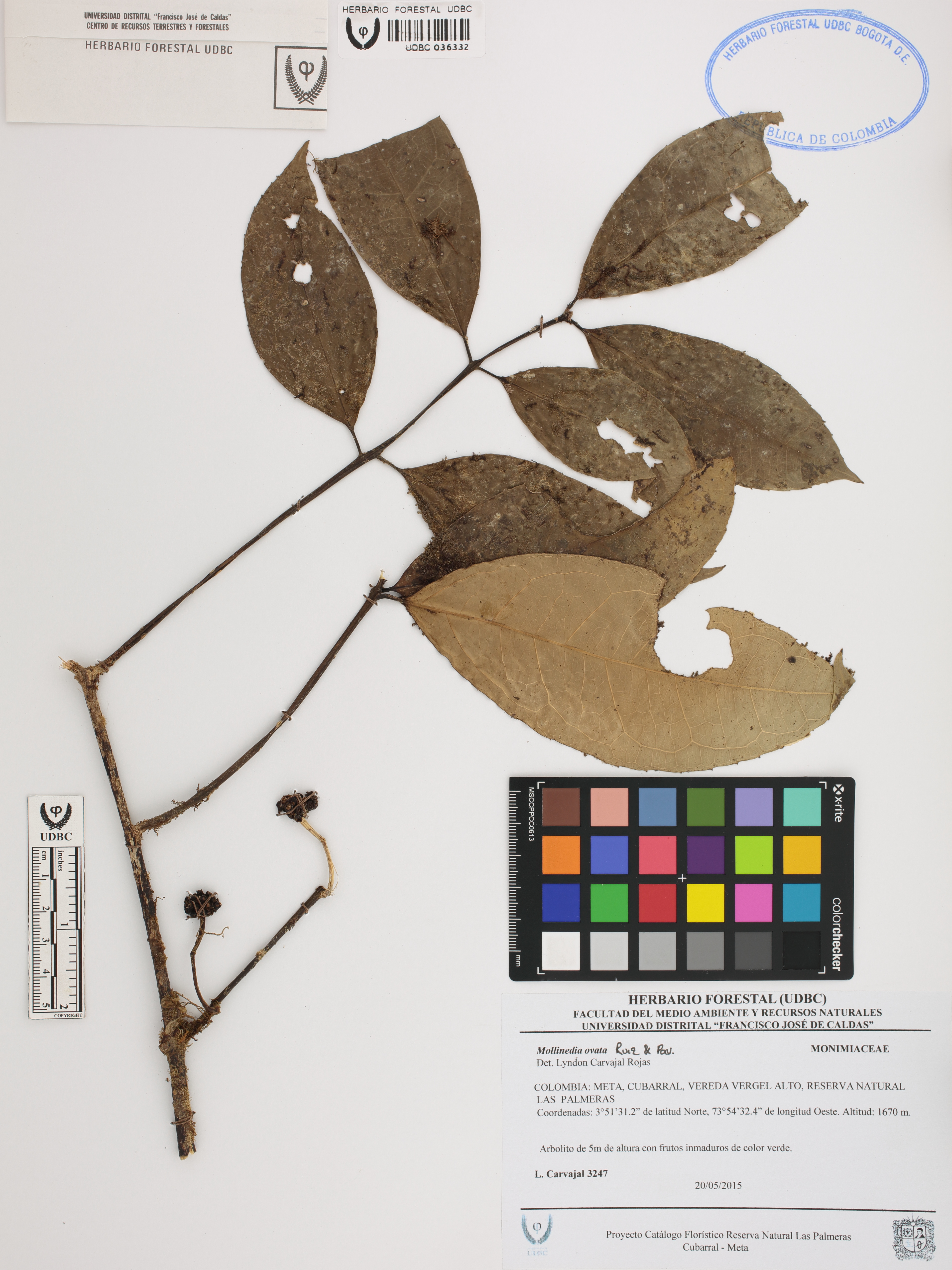 Fotografía del ejemplar Carvajal, L. 3247, determinado como Mollinedia ovata
