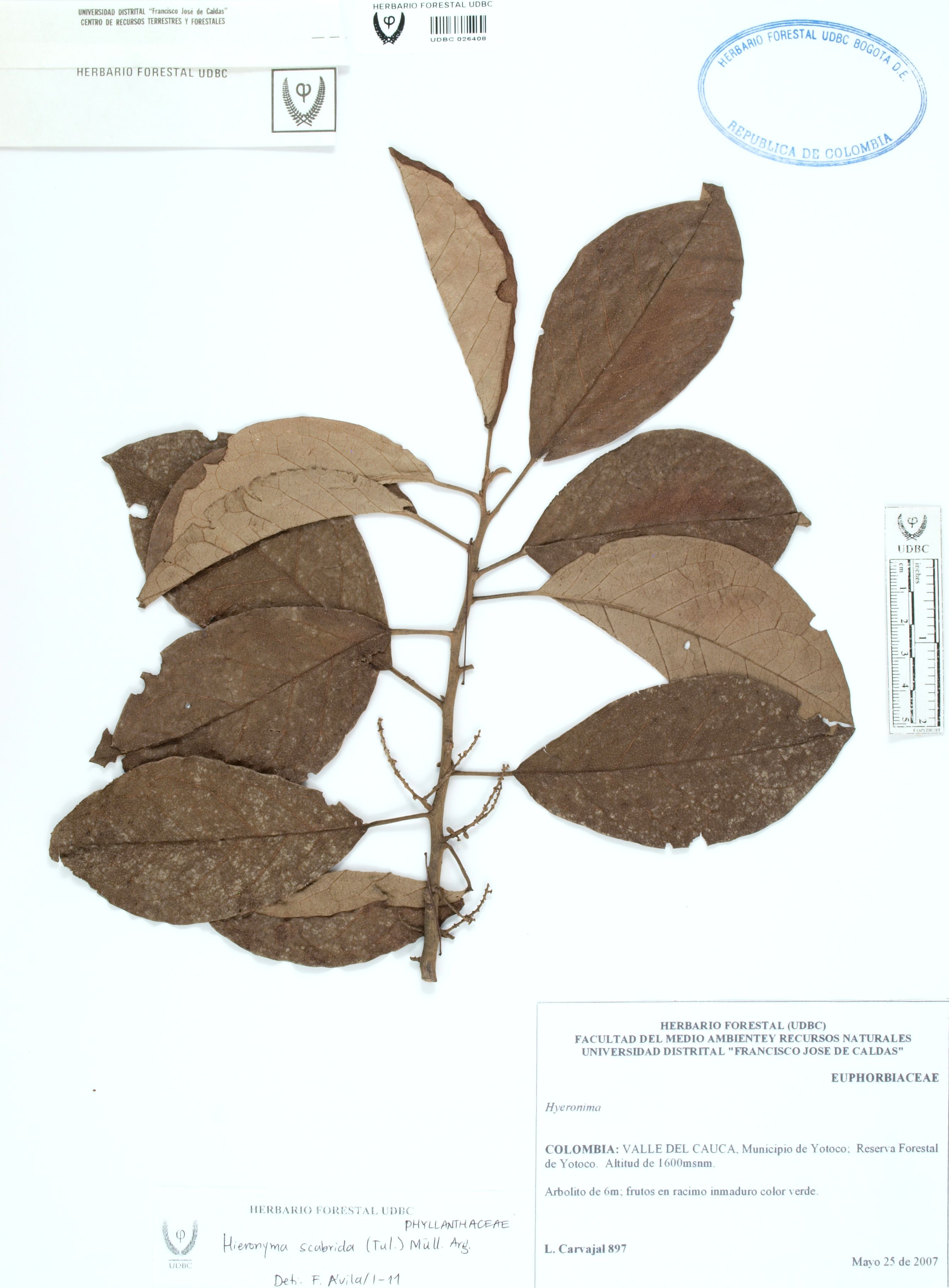 | dc.description | Fotografía del ejemplar Carvajal, L. 897, determinado como Hieronyma scabrida en el año 2011 | |