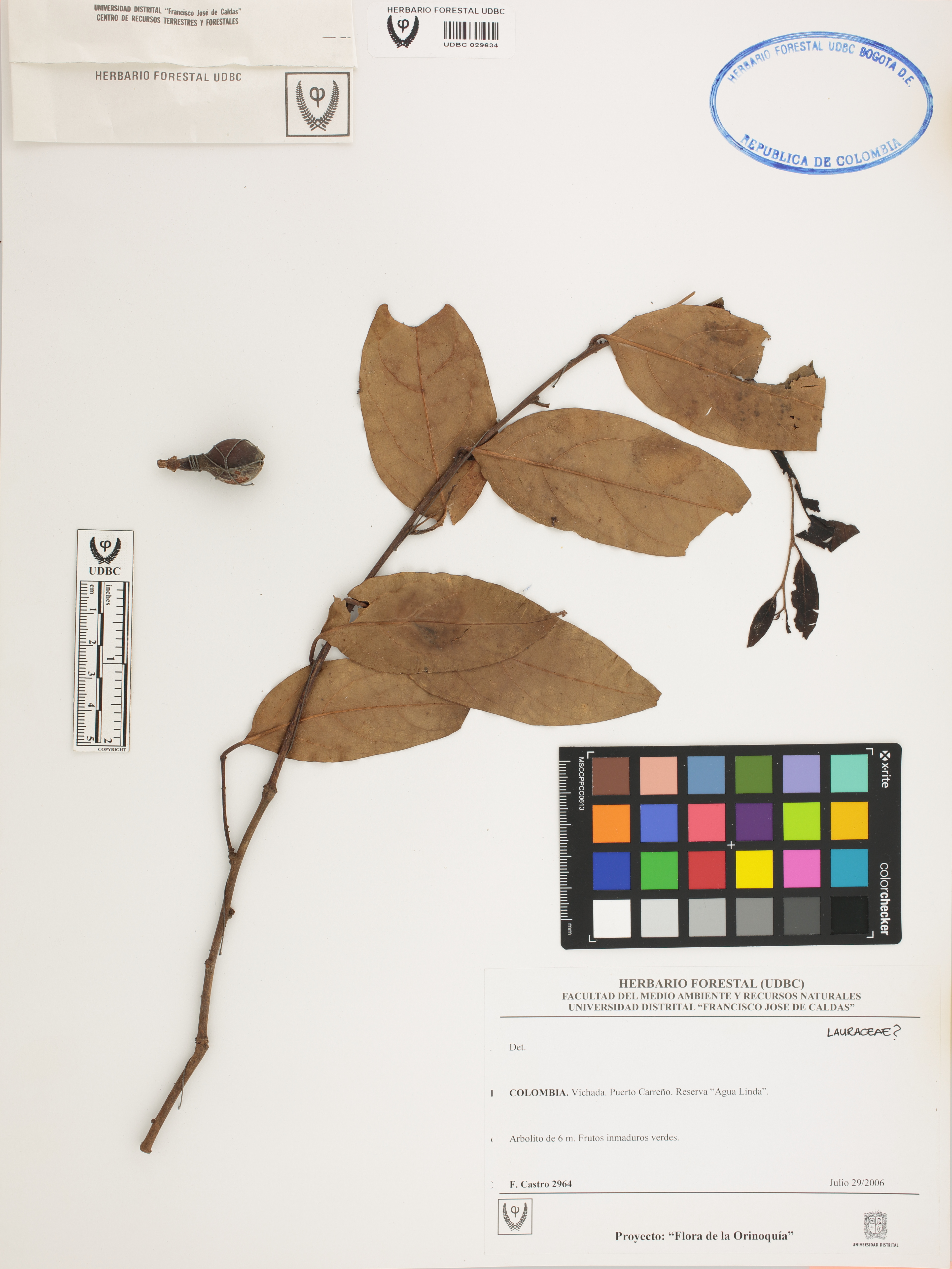 Fotografía del ejemplar Castro, F. 2964, determinado como Lauraceae