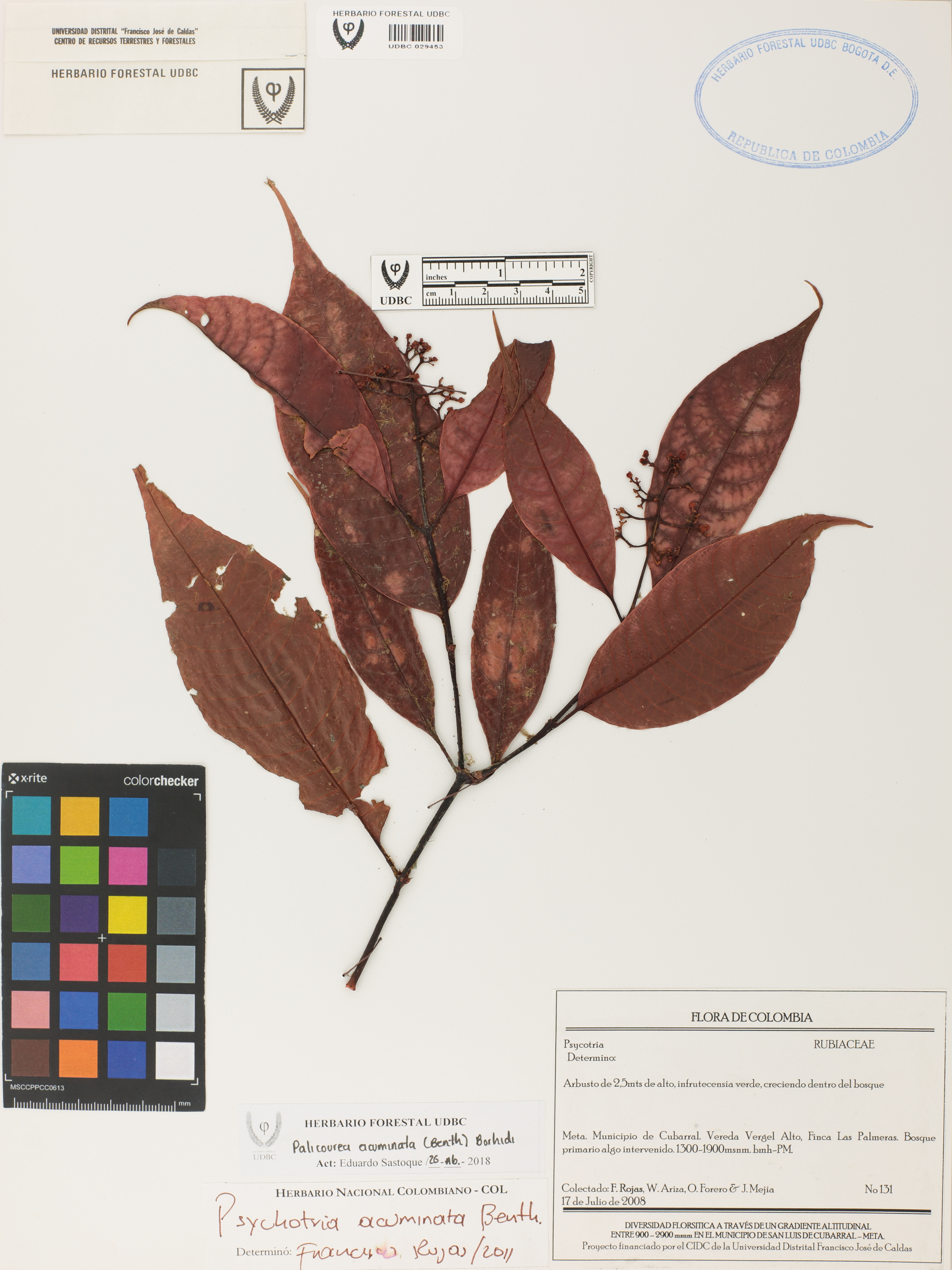 Fotografía del ejemplar Rojas, F. 131, determinado como Palicourea acuminata en el año 2011