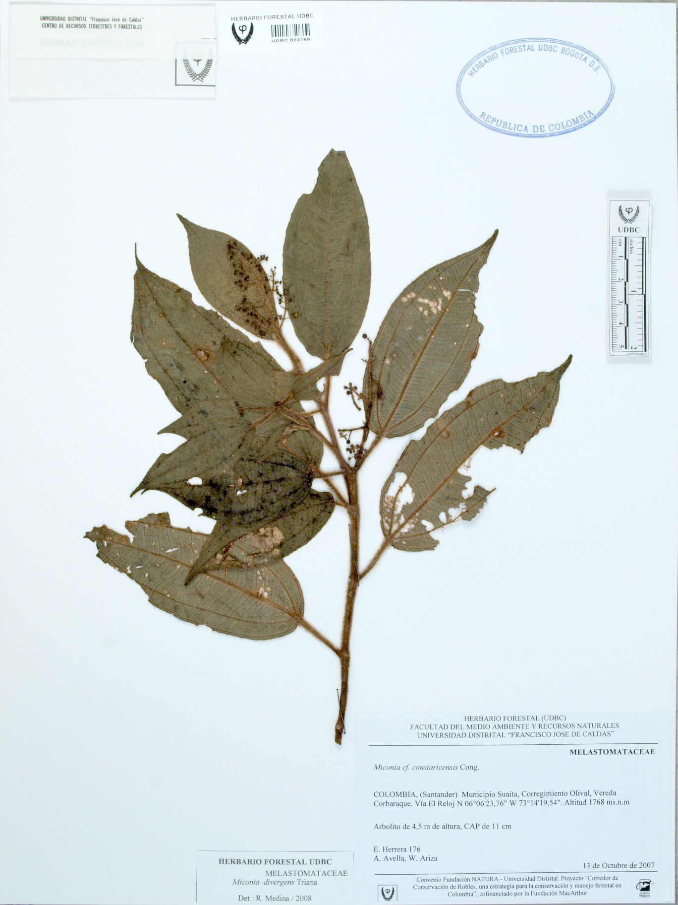 Fotografía del ejemplar Herrera, E. 176, determinado como Miconia divergens en el año 2008