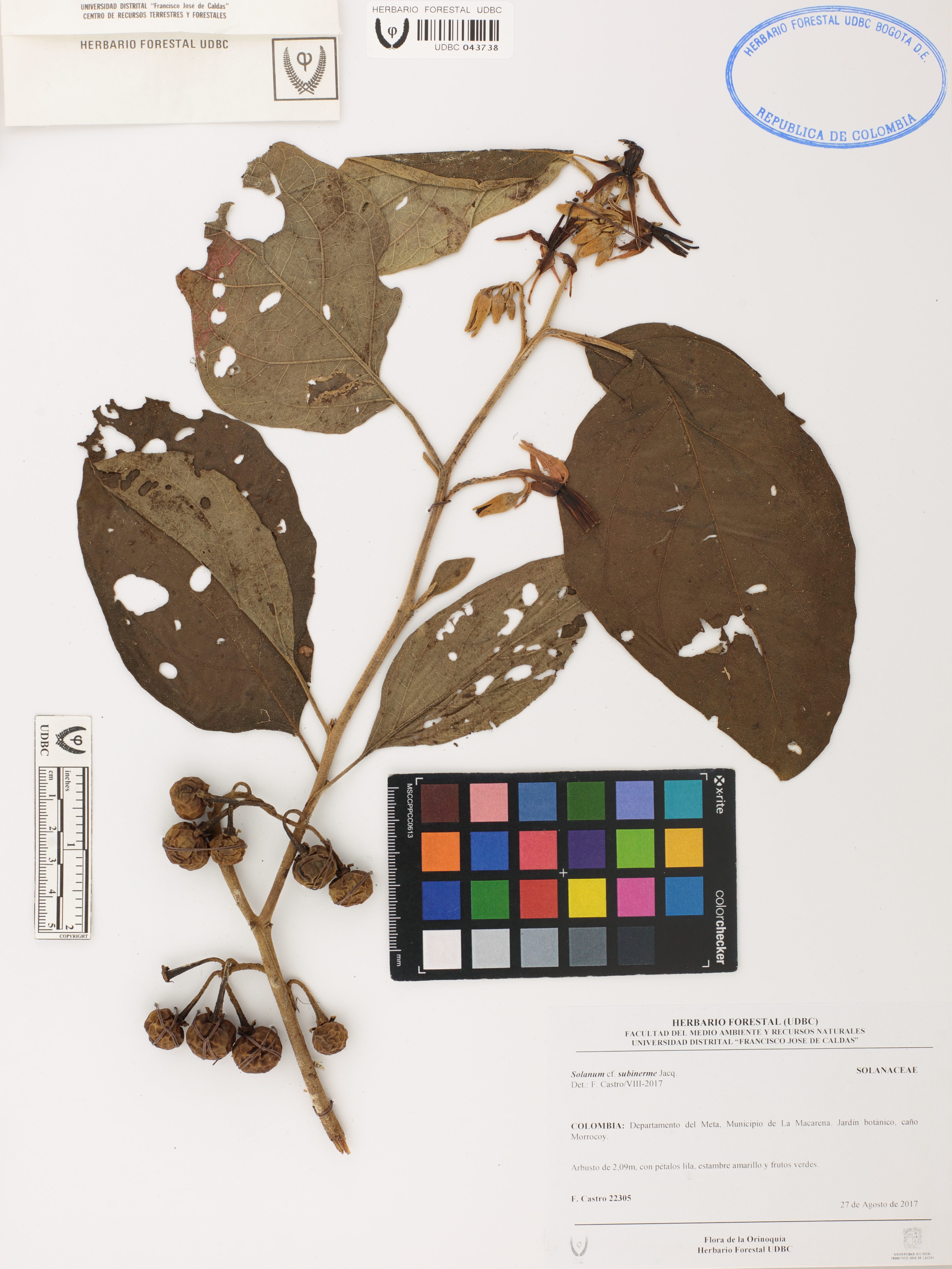Fotografía del ejemplar Castro, F. 22305, determinado como Solanum subinerme en el año 2017