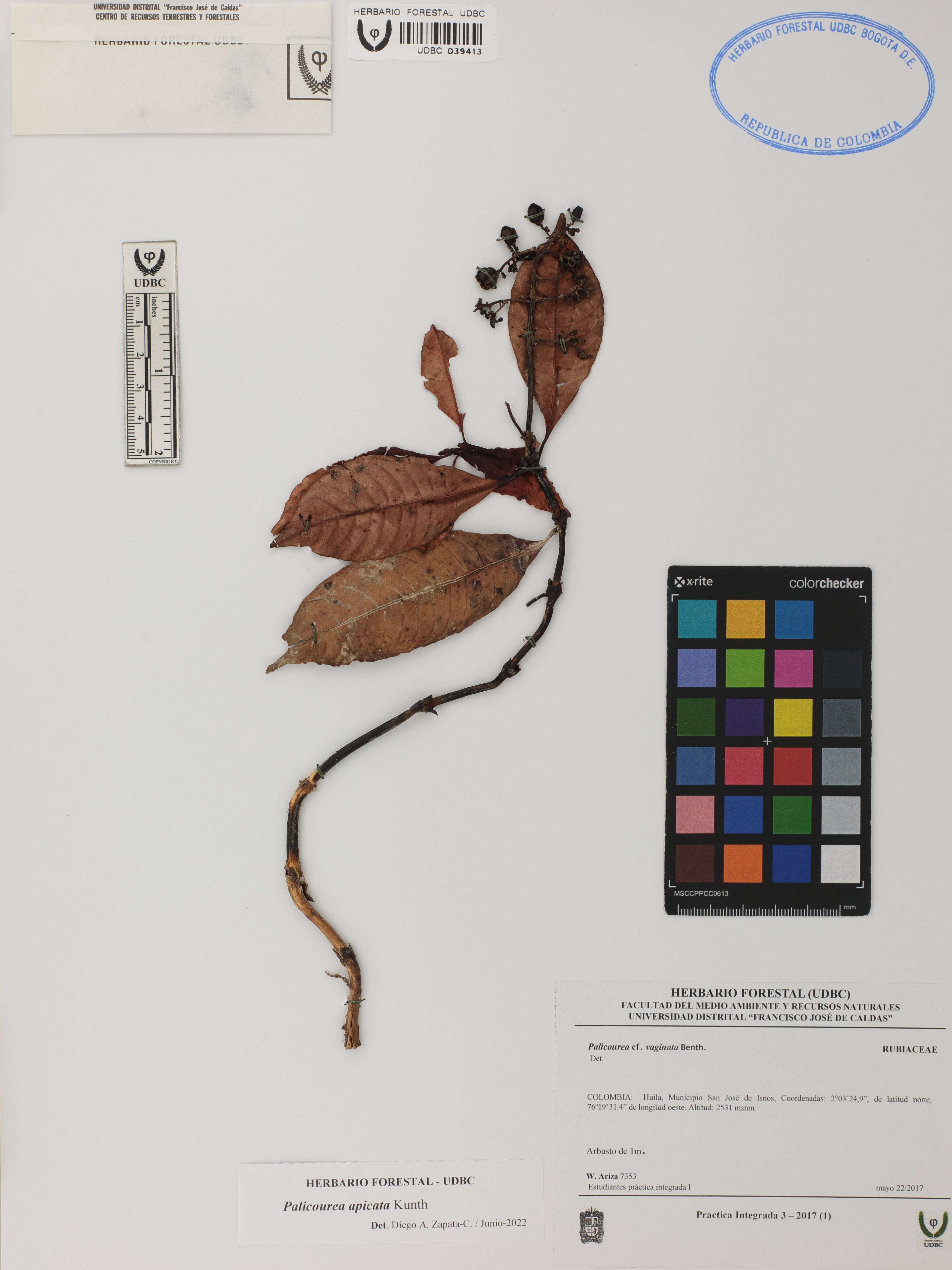 Fotografía del ejemplar Ariza, W. 7353, determinado como Palicourea apicata en el año 2022
