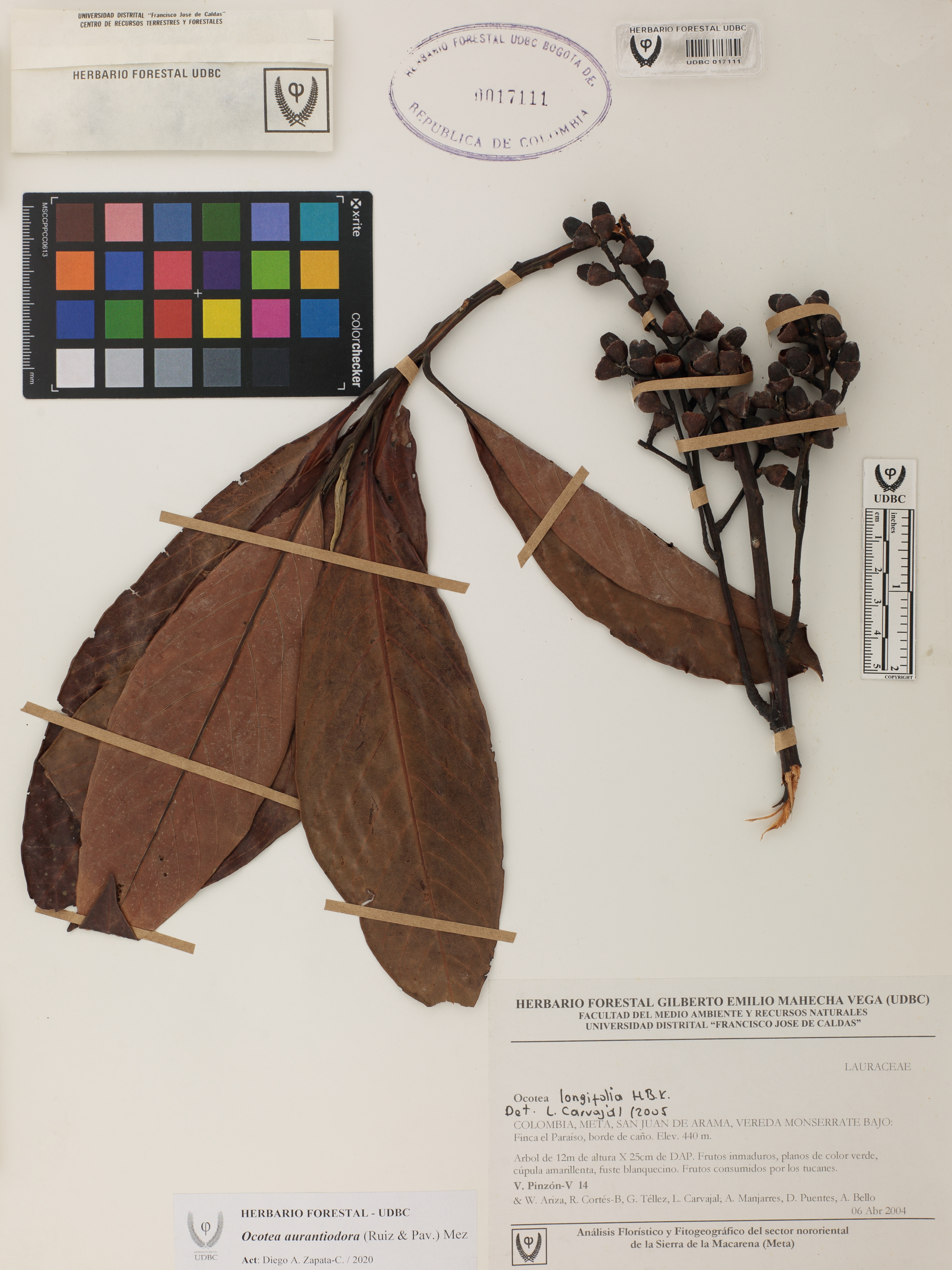 Fotografía del ejemplar Pinzón-V., V. 14, determinado como Ocotea aurantiodora en el año 2005