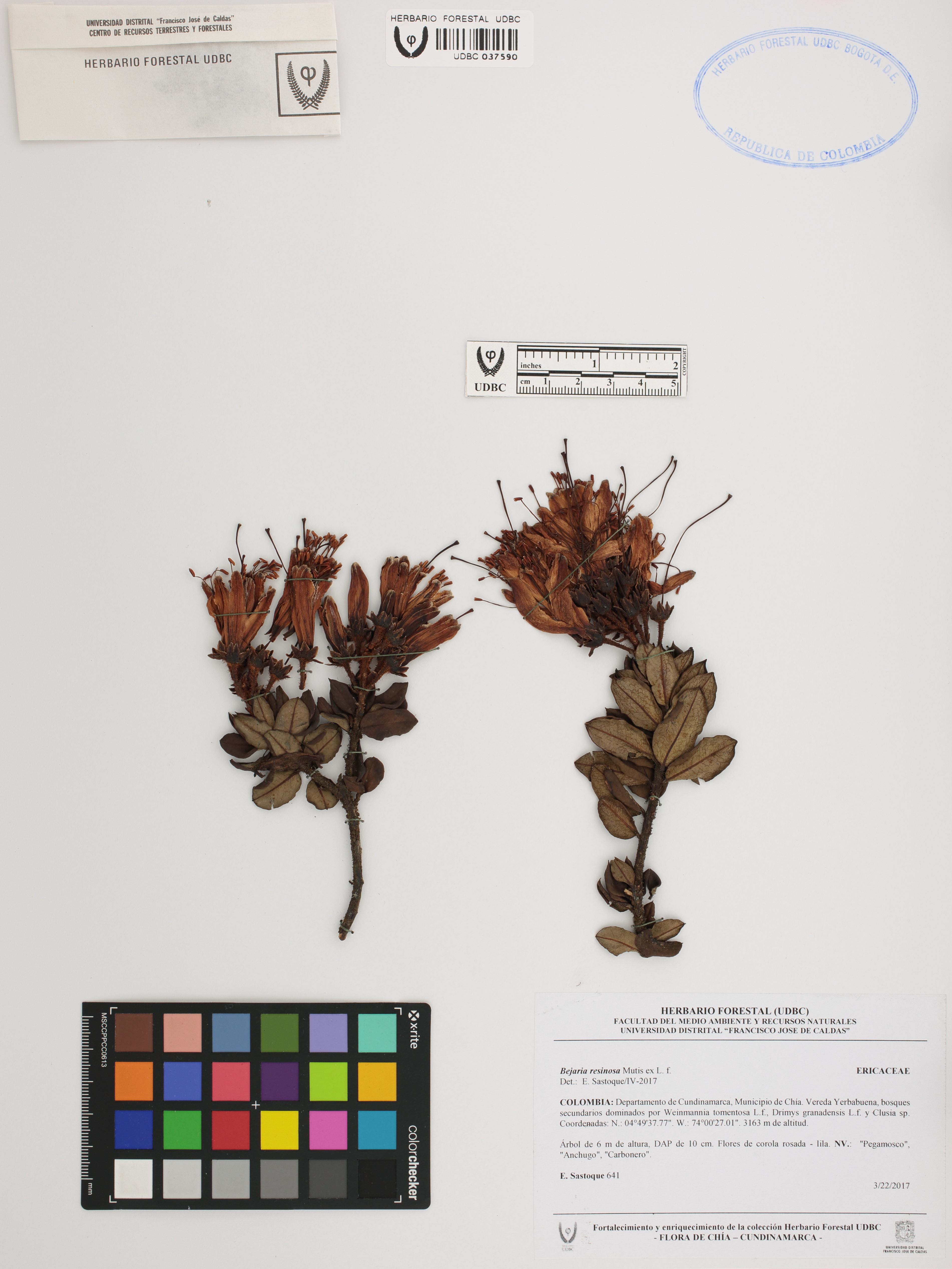 Fotografía del ejemplar Sastoque, E. 641, determinado como Bejaria resinosa en el año 2017