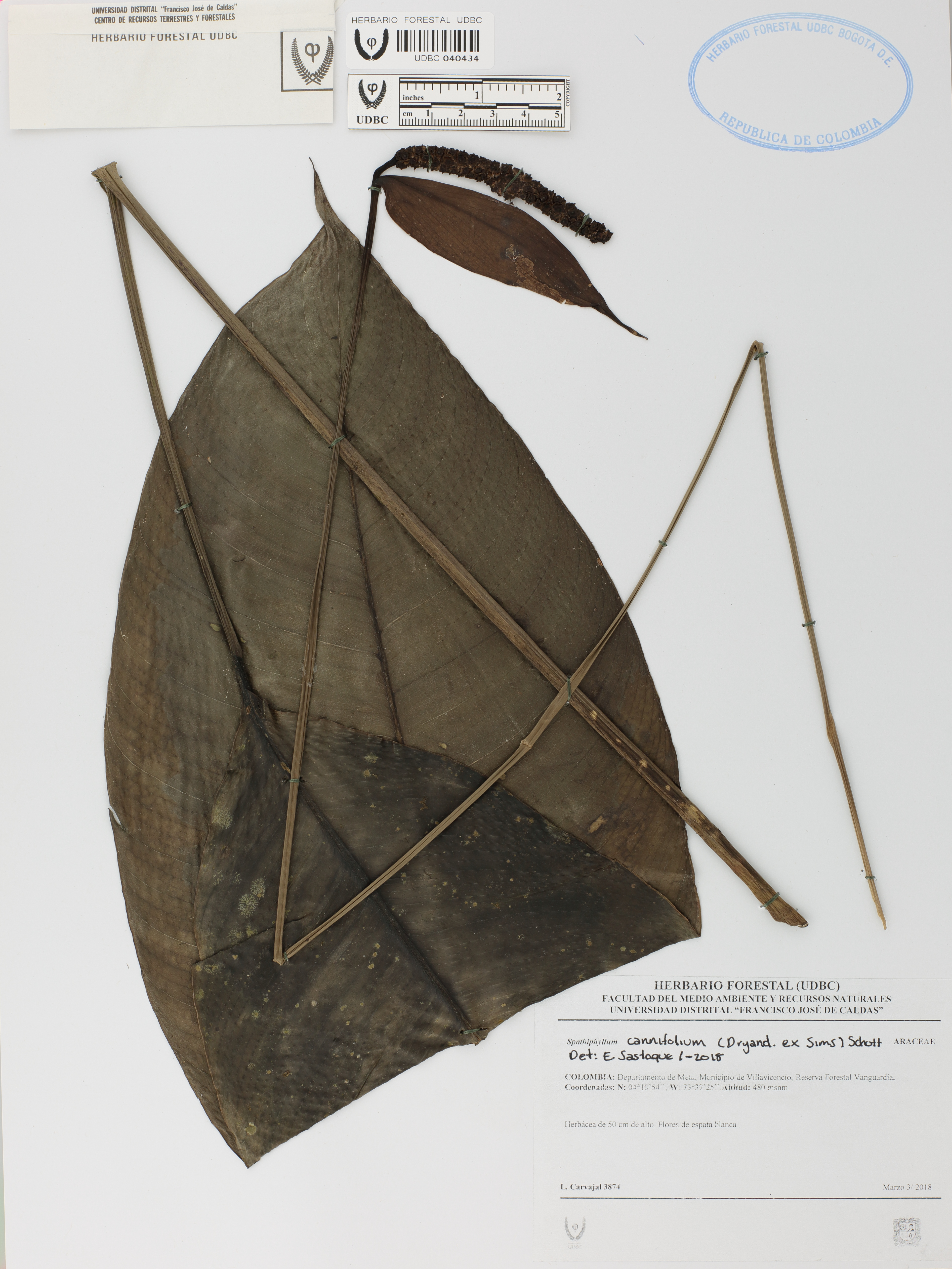 Fotografía del ejemplar Carvajal, L. 3874, determinado como Spathiphyllum cannifolium en el año 2018