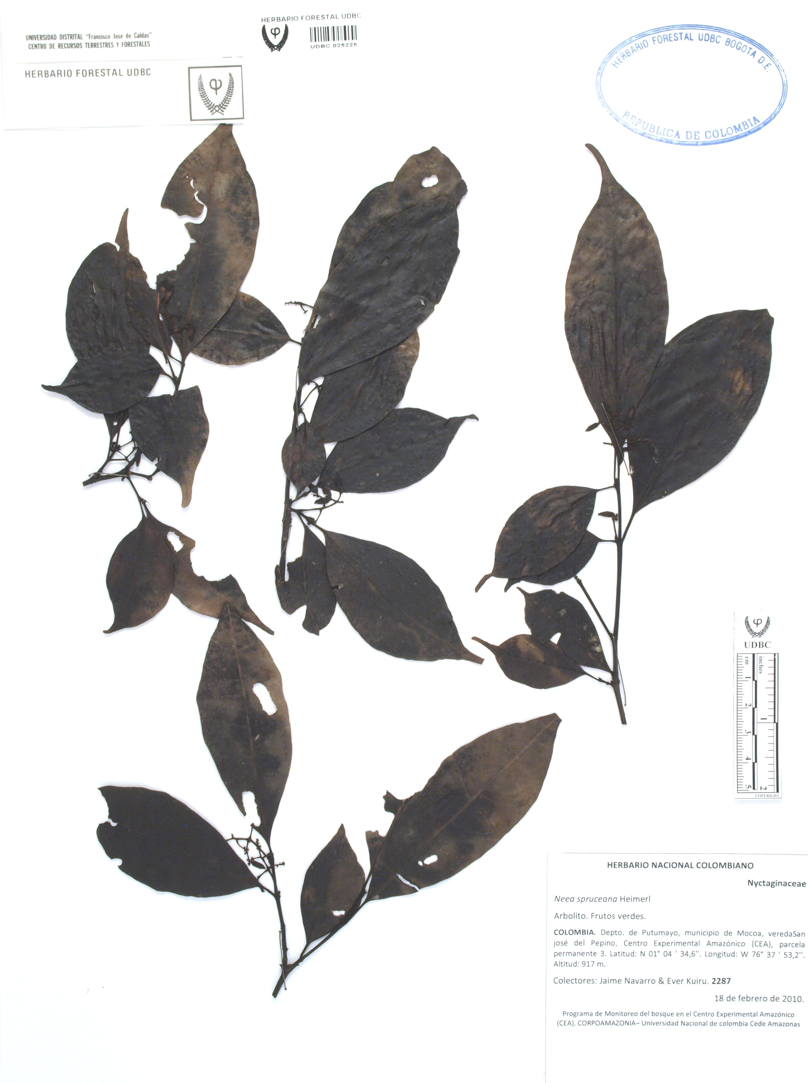 Fotografía del ejemplar Navarro, J. 2287, determinado como Neea spruceana