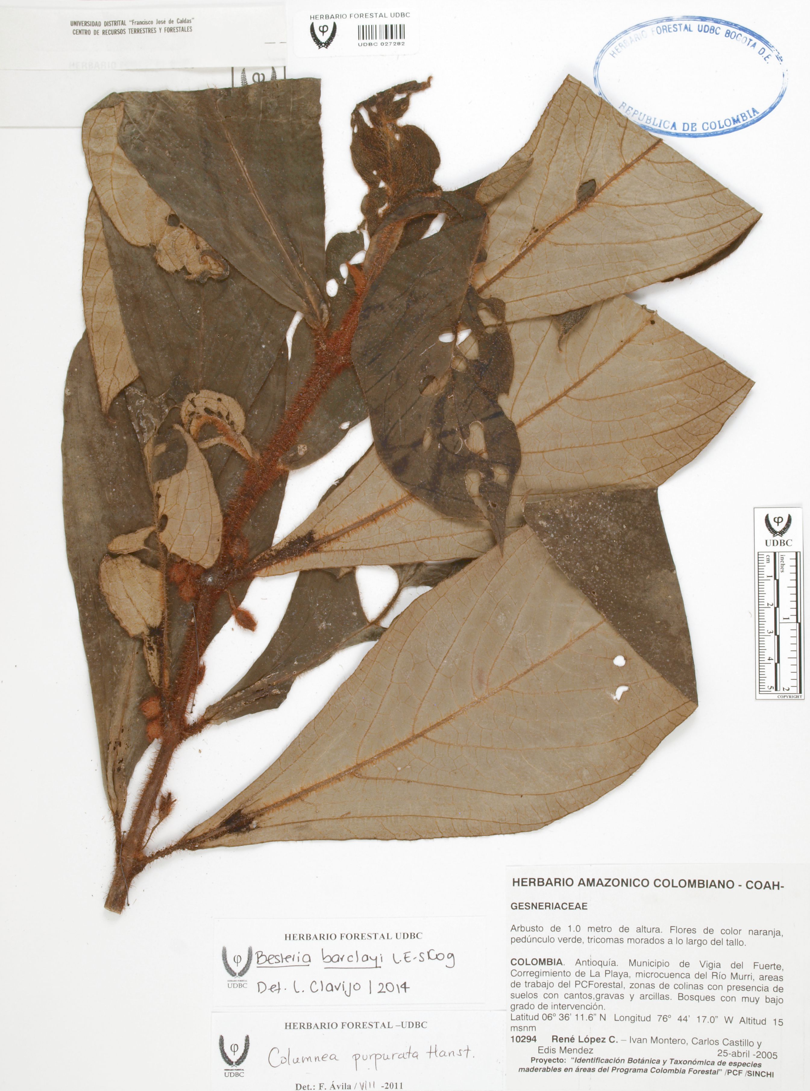 Fotografía del ejemplar López, R. 10294, determinado como Besleria barclayi en el año 2014