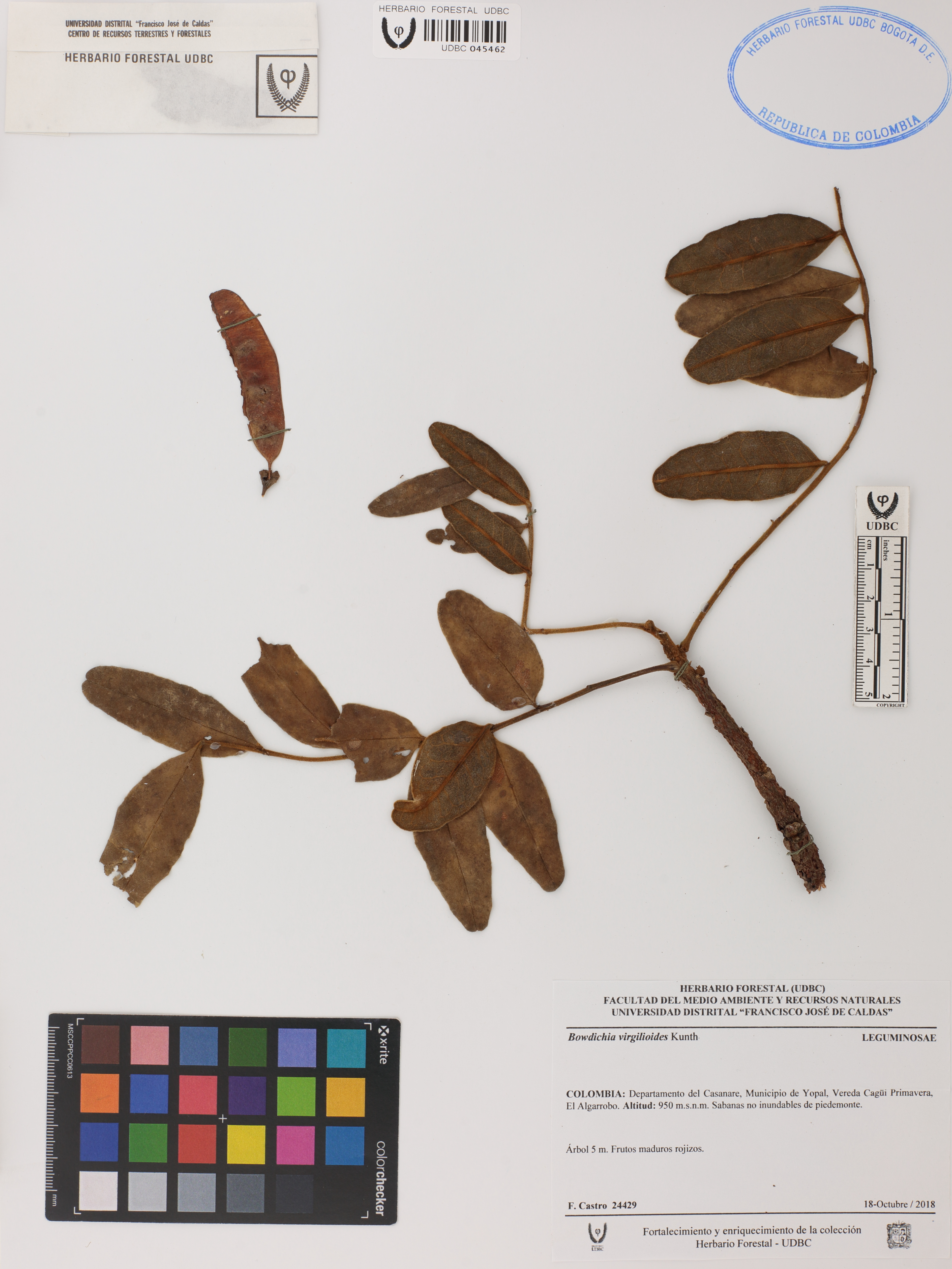 | dc.description | Fotografía del ejemplar Castro, F. 24429, determinado como Bowdichia virgilioides en el año 2018 | |