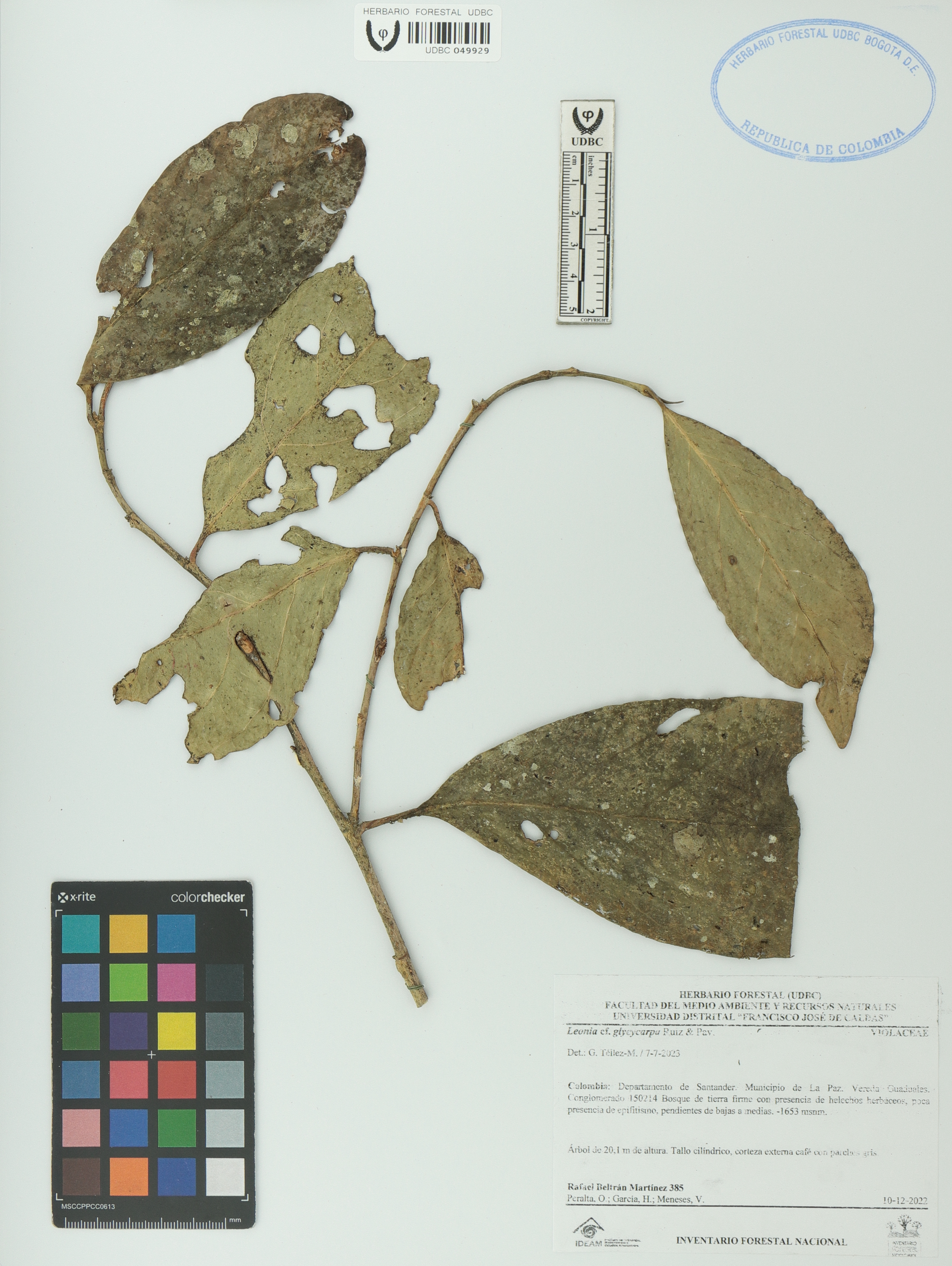 Fotografía del ejemplar Beltrán-M., R. 385, determinado como Leonia glycycarpa en el año 2023