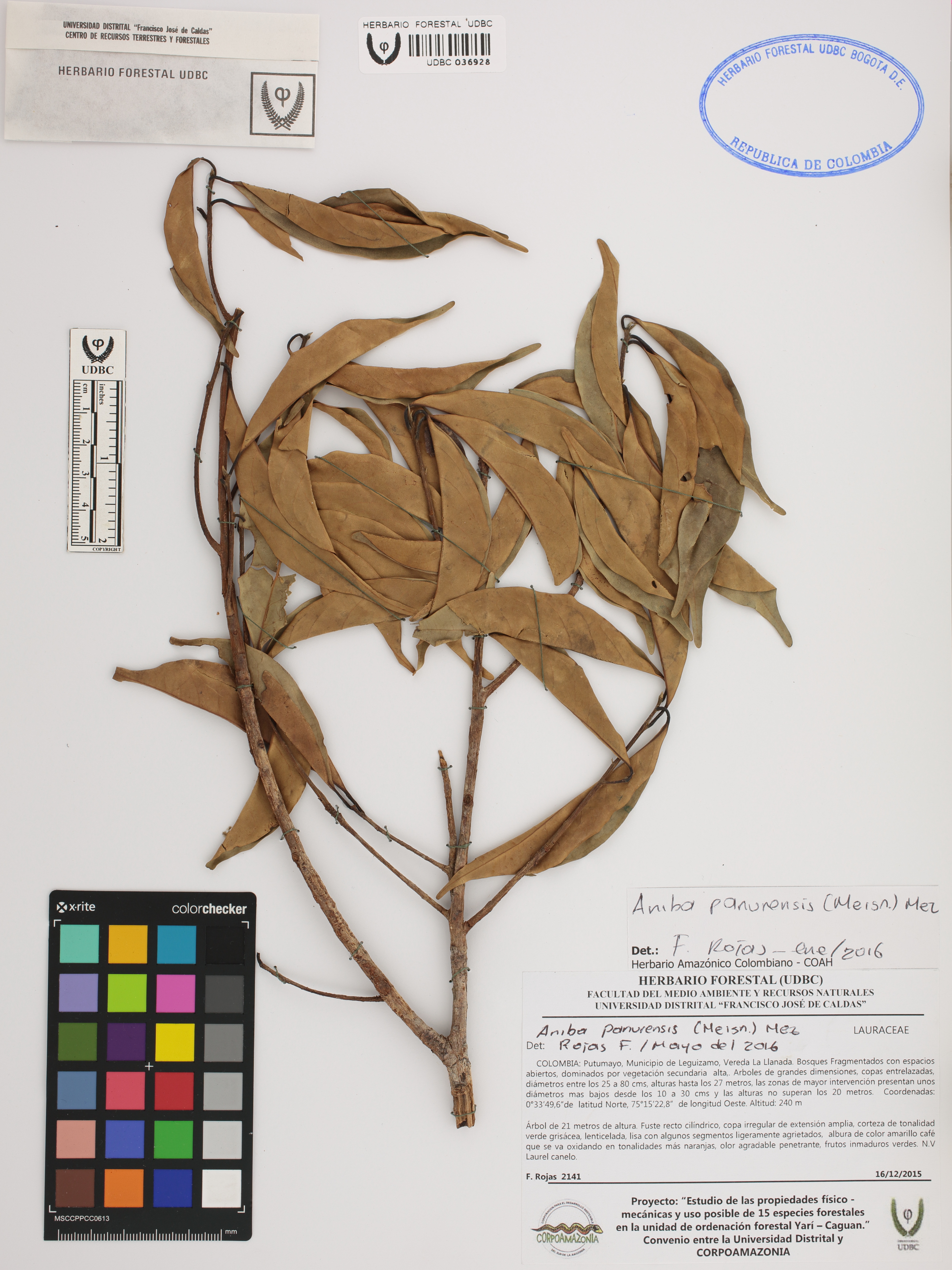 Fotografía del ejemplar Rojas, F. 2141, determinado como Aniba panurensis en el año 2016