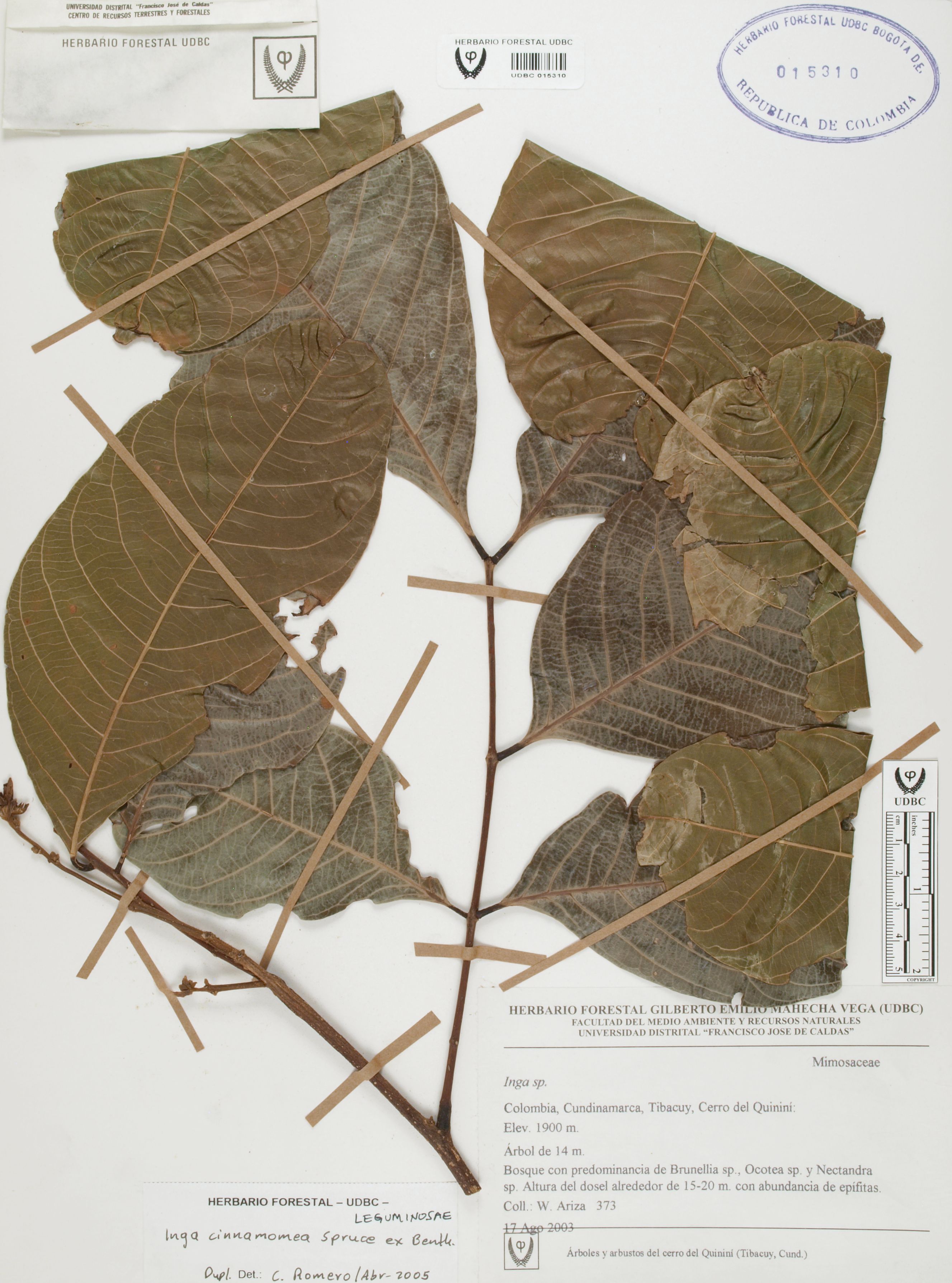 Fotografía del ejemplar Ariza, W. 373, determinado como Inga cinnamomea en el año 2005