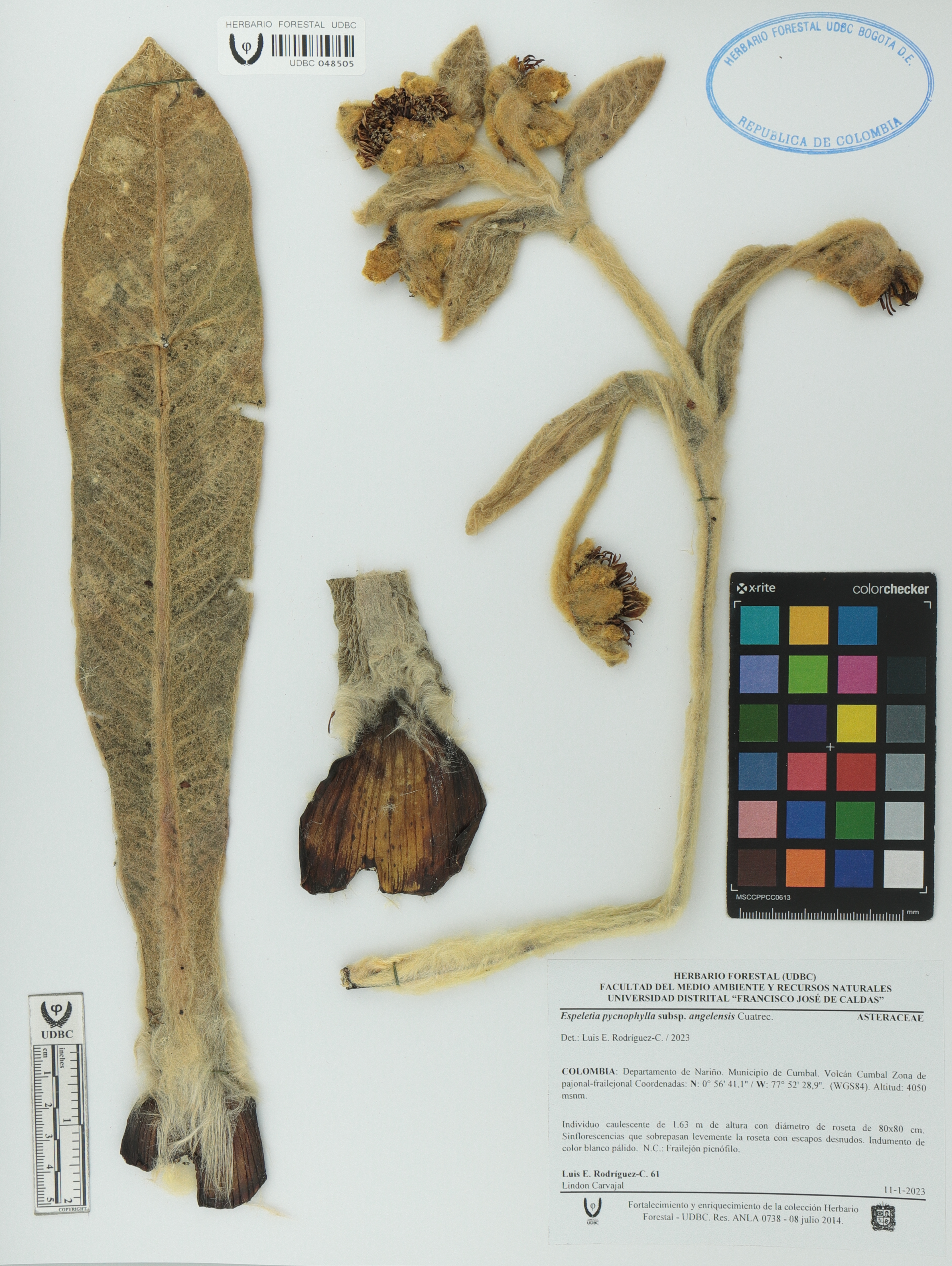 Fotografía del ejemplar Rodríguez-C., Luis 61, determinado como Espeletia pycnophylla subsp. angelensis en el año 2023