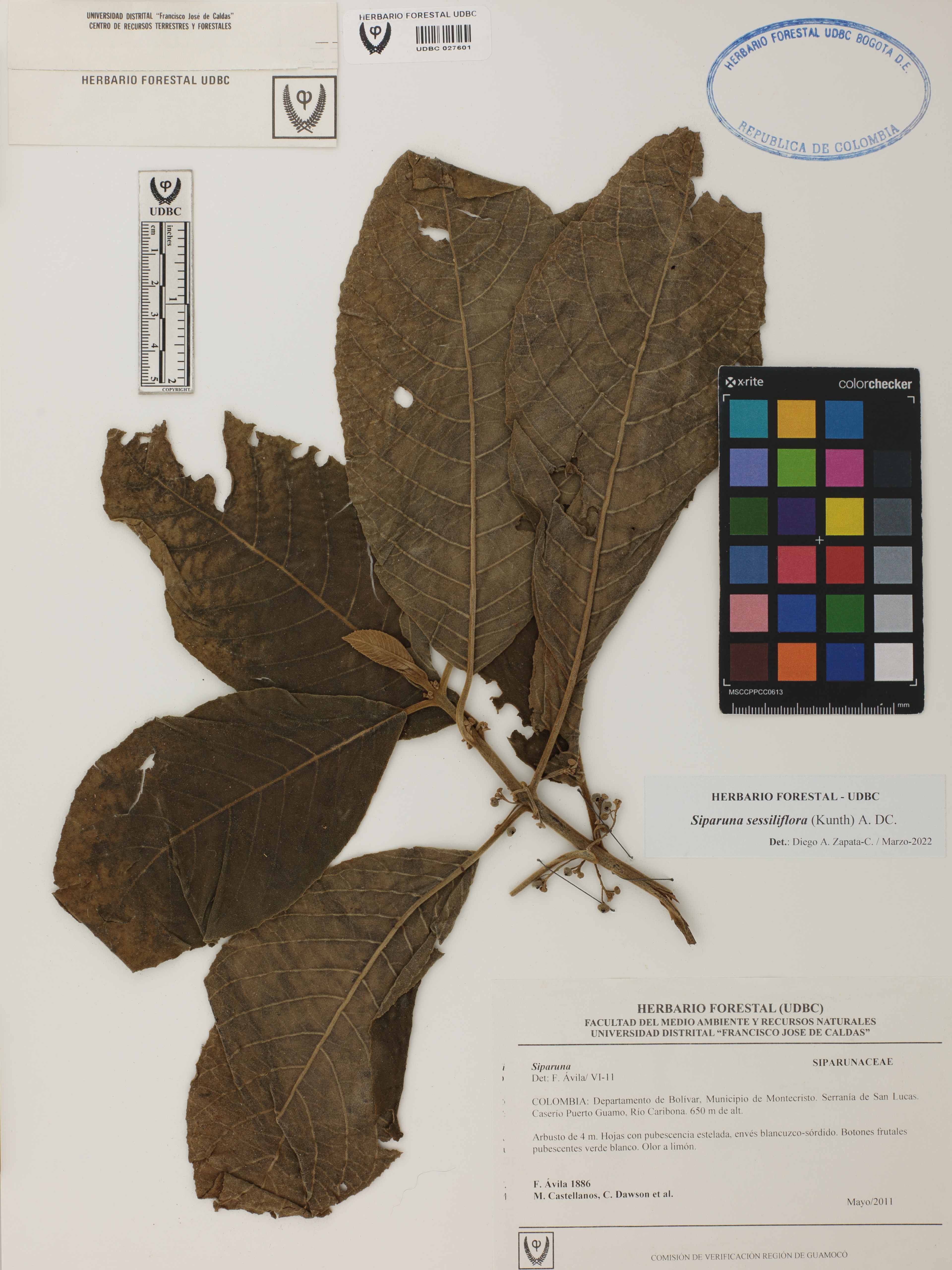 Fotografía del ejemplar Ávila, F. 1886, determinado como Siparuna sessiliflora en el año 2022