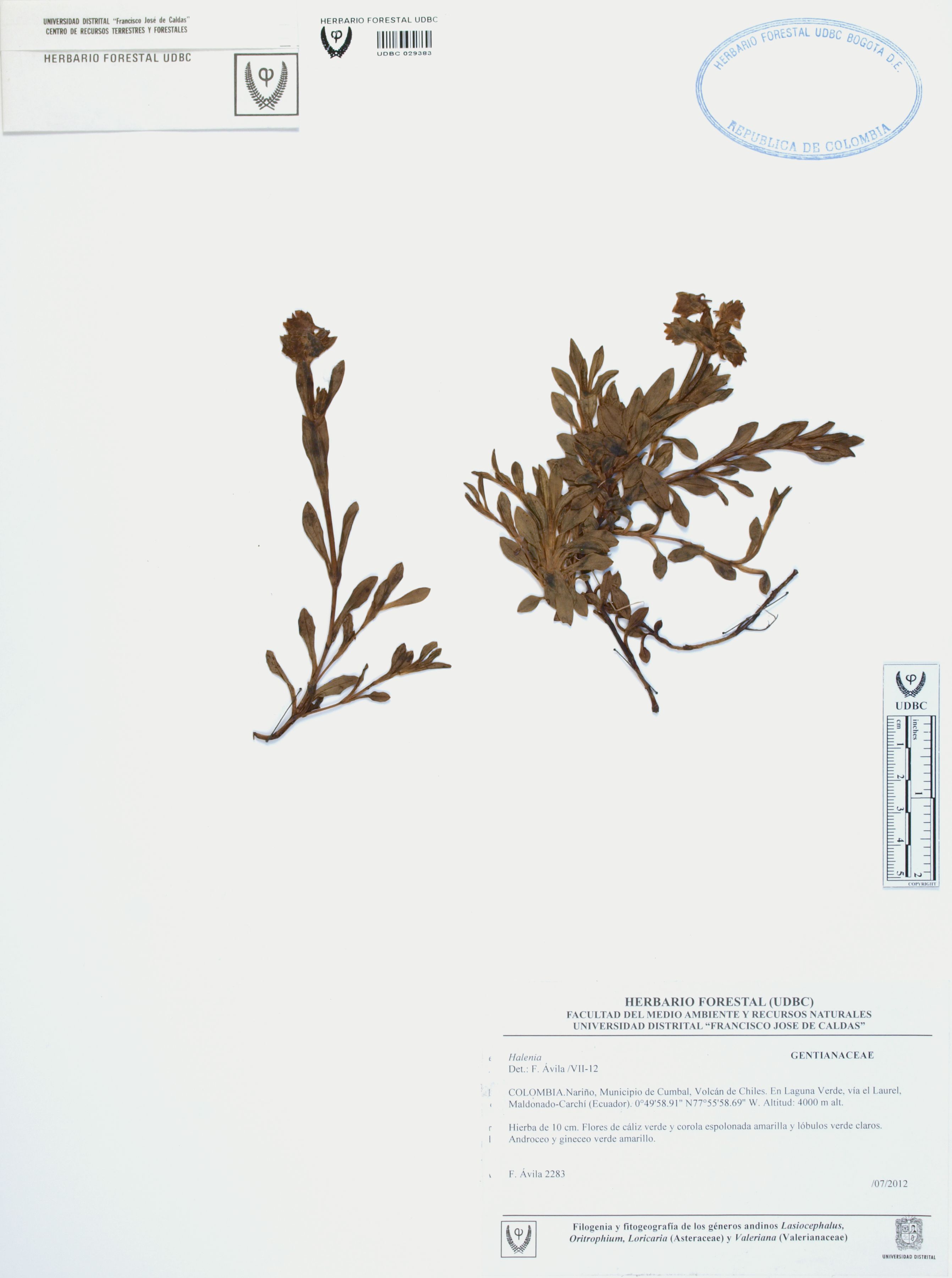 | dc.description | Fotografía del ejemplar Ávila, F. 2283, determinado como Halenia sp. en el año 2012 | |