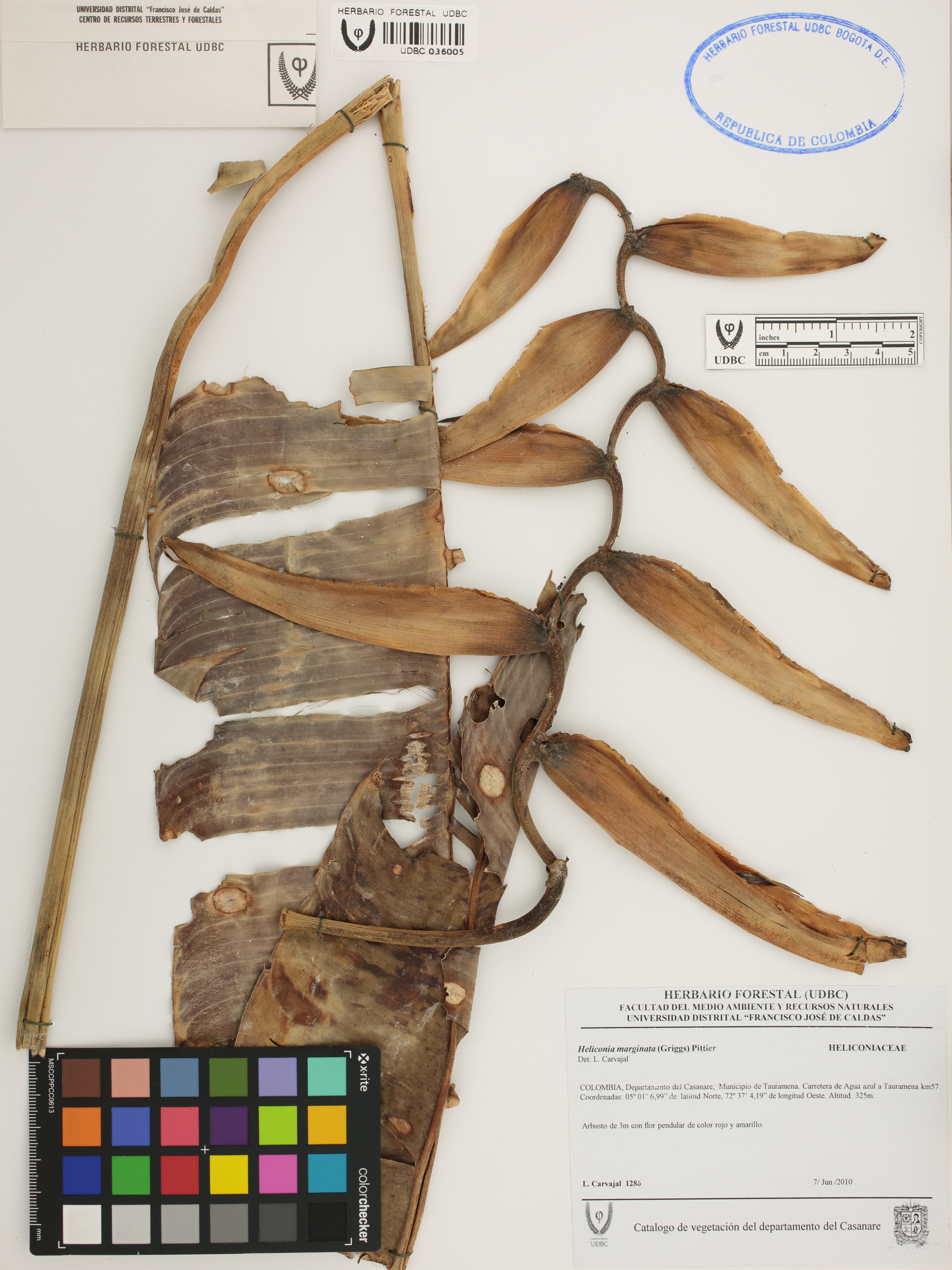 Fotografía del ejemplar Carvajal, L. 1286, determinado como Heliconia marginata