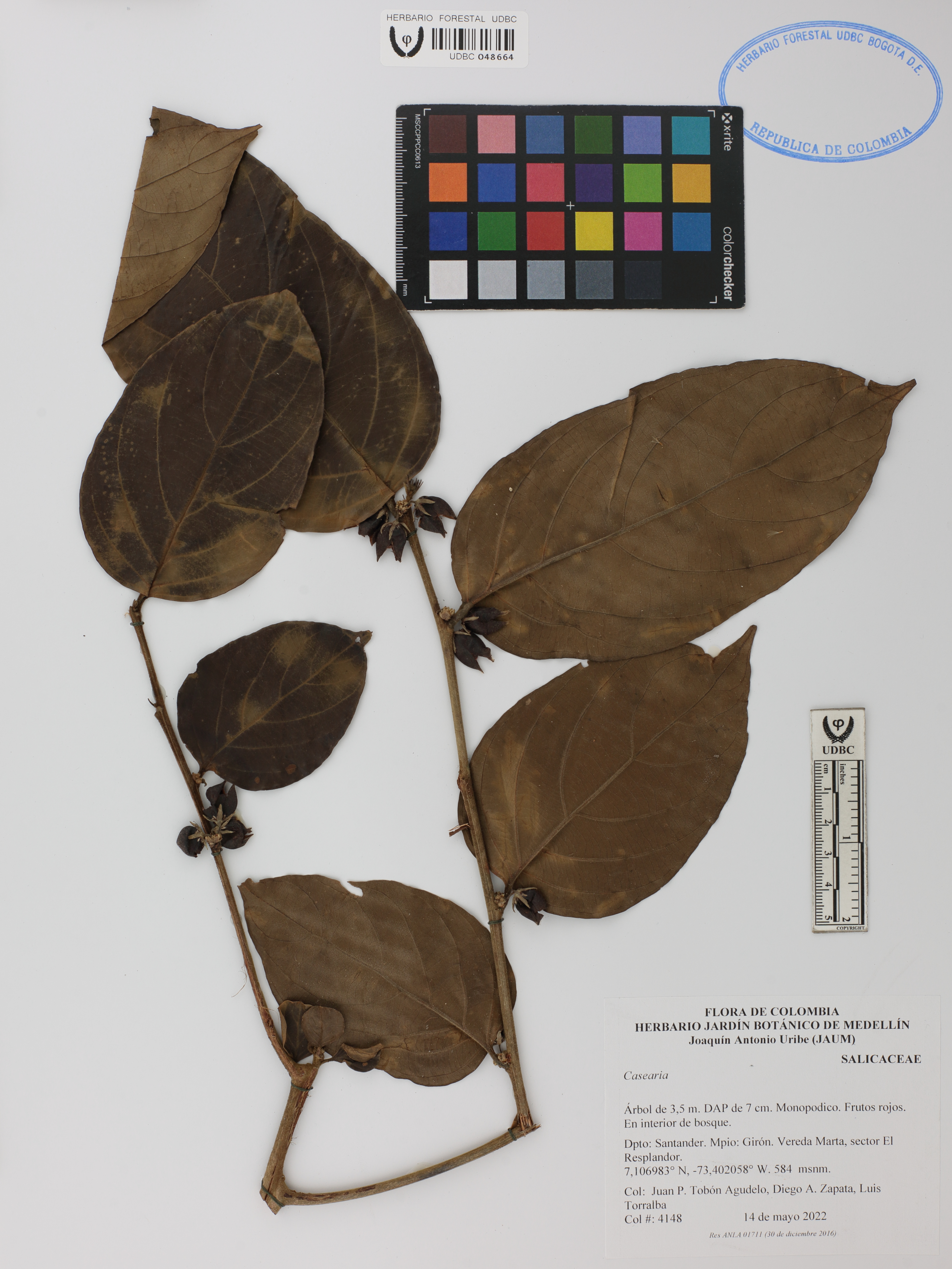 Fotografía del ejemplar Tobón-A., J. 4148, determinado como Casearia sp.