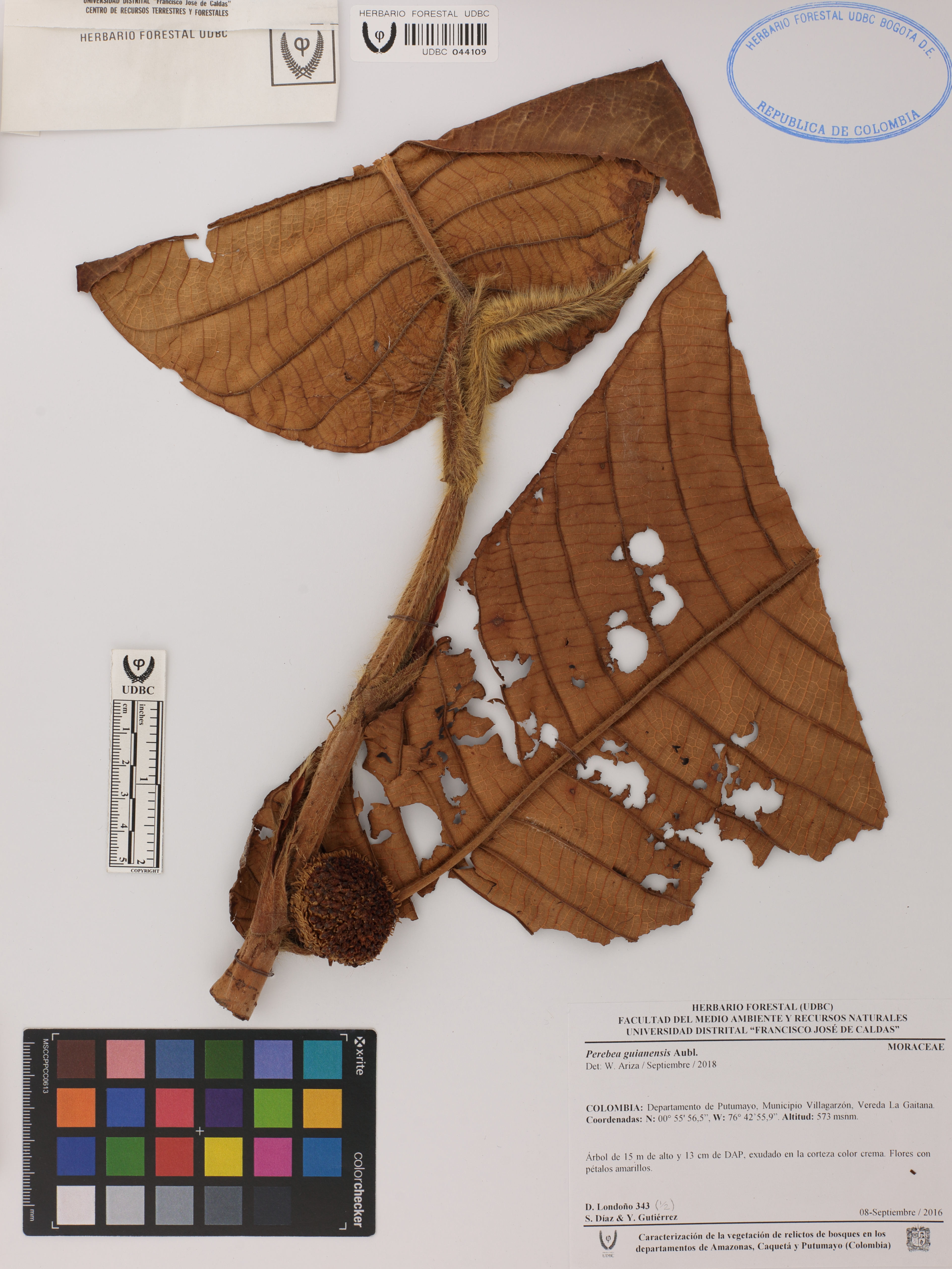 Fotografía del ejemplar Londoño, D. 343, determinado como Perebea guianensis en el año 2016