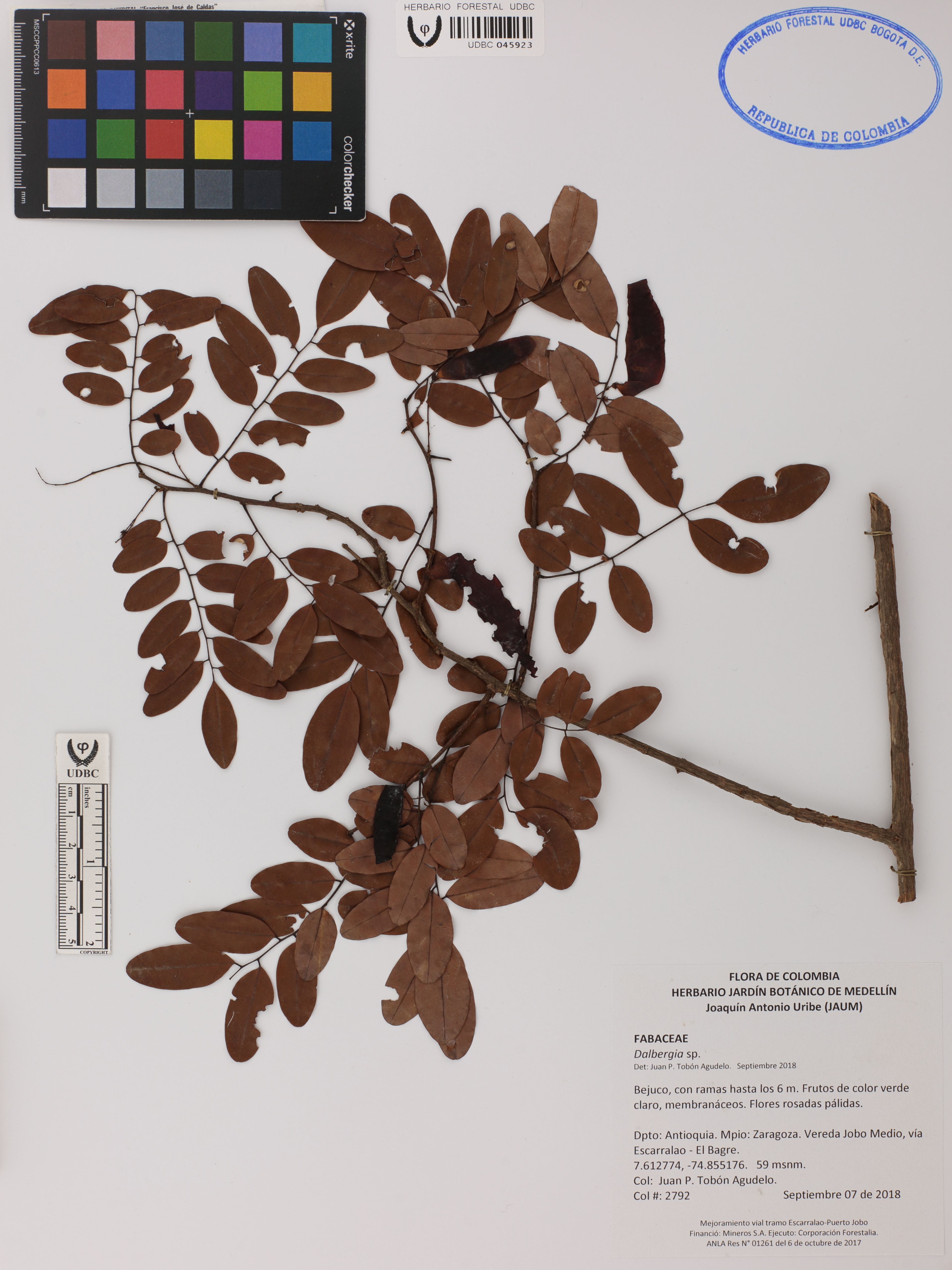 Fotografía del ejemplar Tobón-Agudelo, J. 2792, determinado como Dalbergia sp. en el año 2018