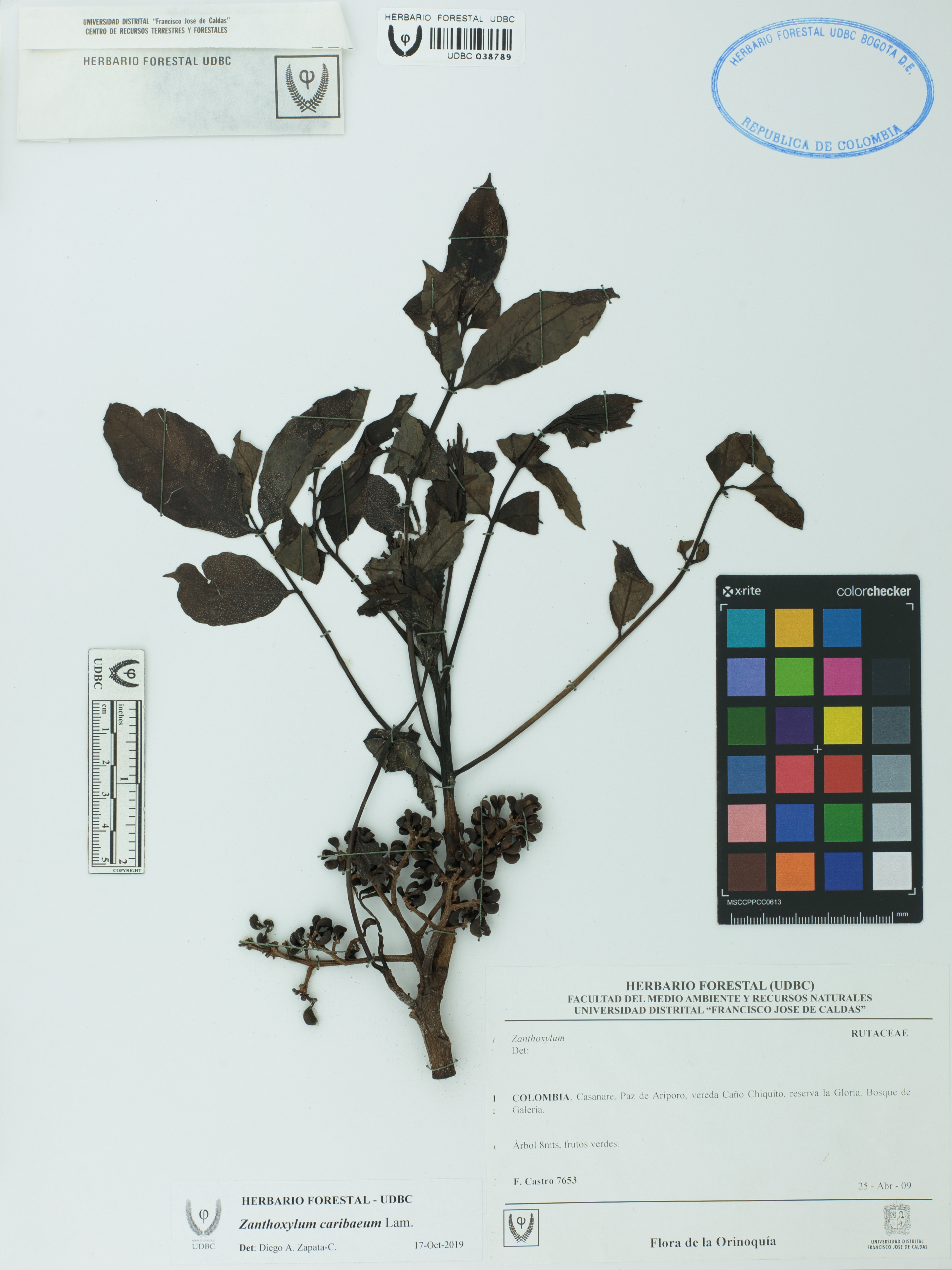 Fotografía del ejemplar Castro, F. 7653, determinado como Zanthoxylum caribaeum en el año 2019