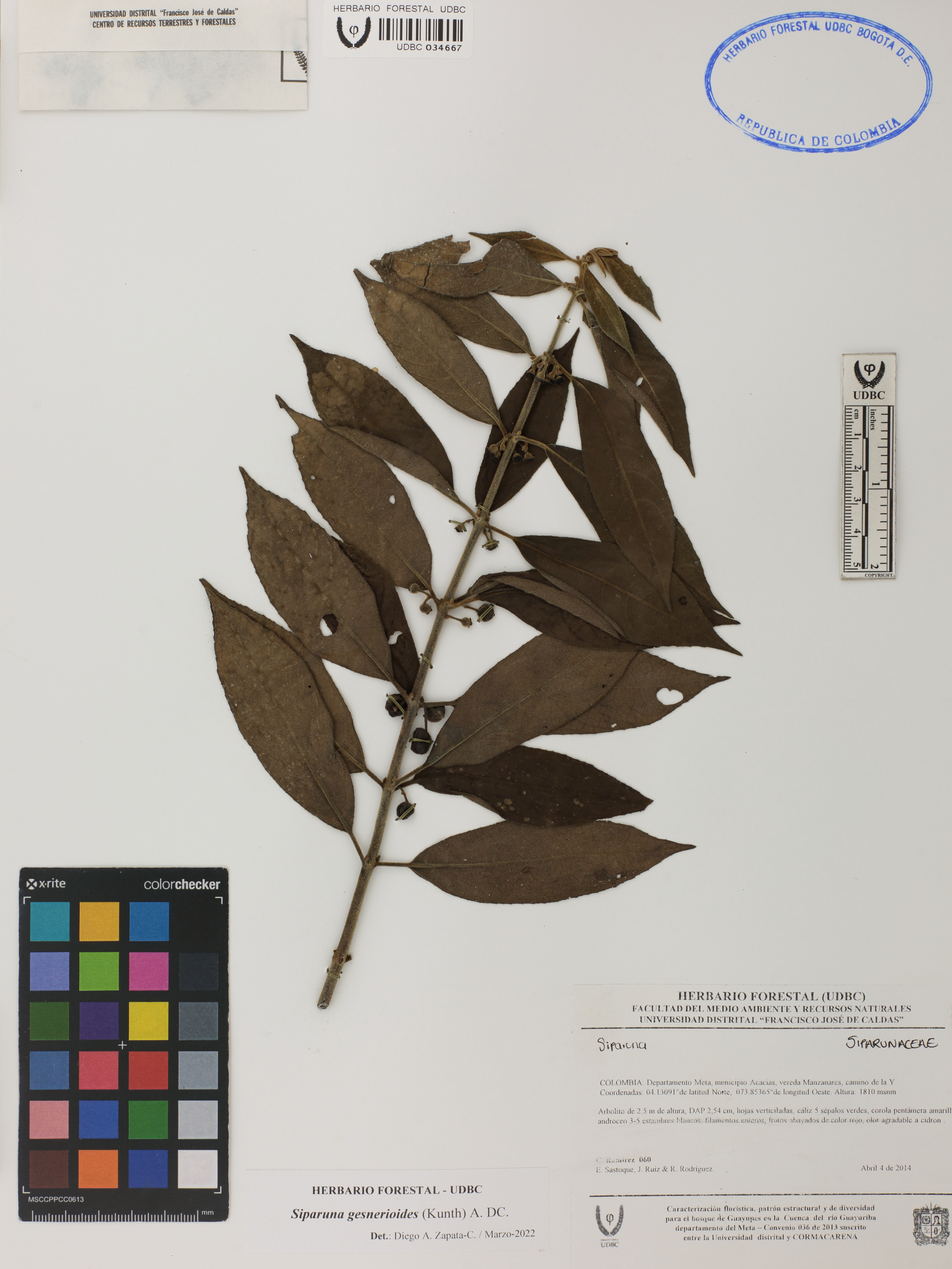 Fotografía del ejemplar Ramírez, C. 60, determinado como Siparuna gesnerioides en el año 2022