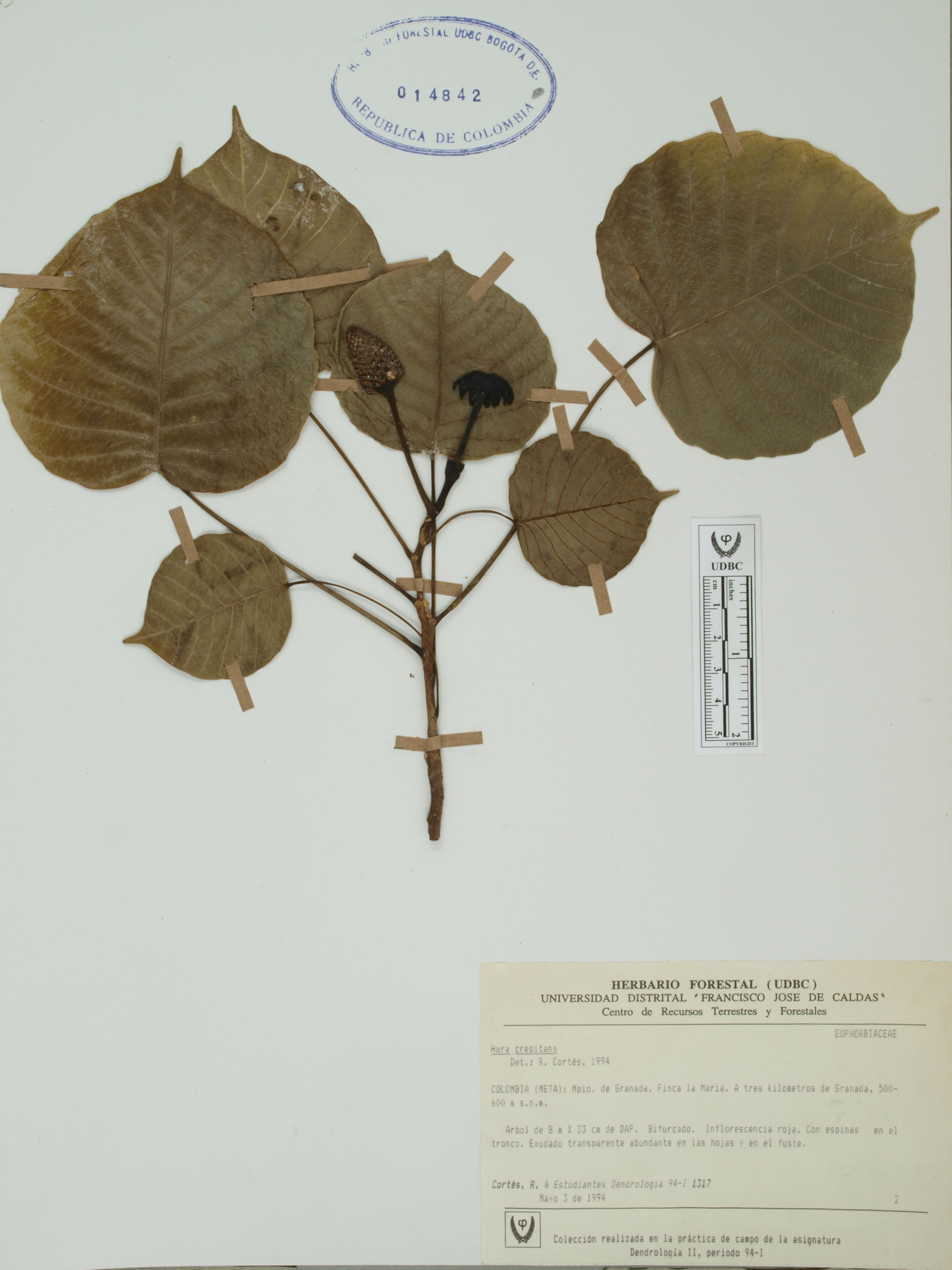 Fotografía del ejemplar Cortés-B., R. 1317, determinado como Hura crepitans en el año 1994